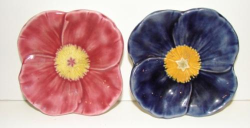 PAIR OF FIGURAL FLORAL WEDGWOOD BUTTER PATS. One is in the form of a blue flower and the other is in the form of a pink flower. Both are stamped on bottom "WEDGWOOD". 3" Dia.