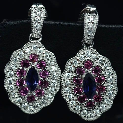 Pair of white gold over sterling silver earrings with iolite, rhodolite & topaz gemstones.
