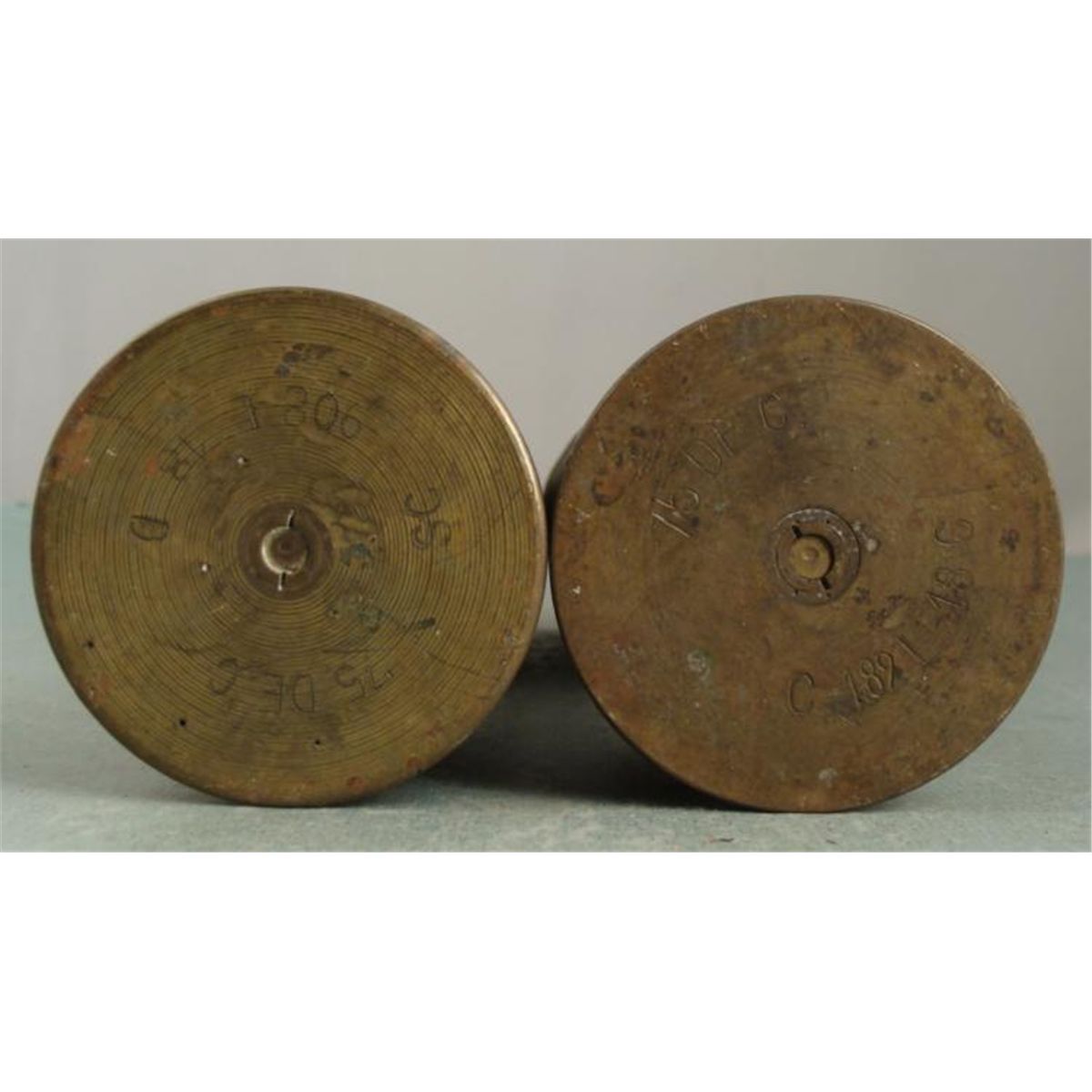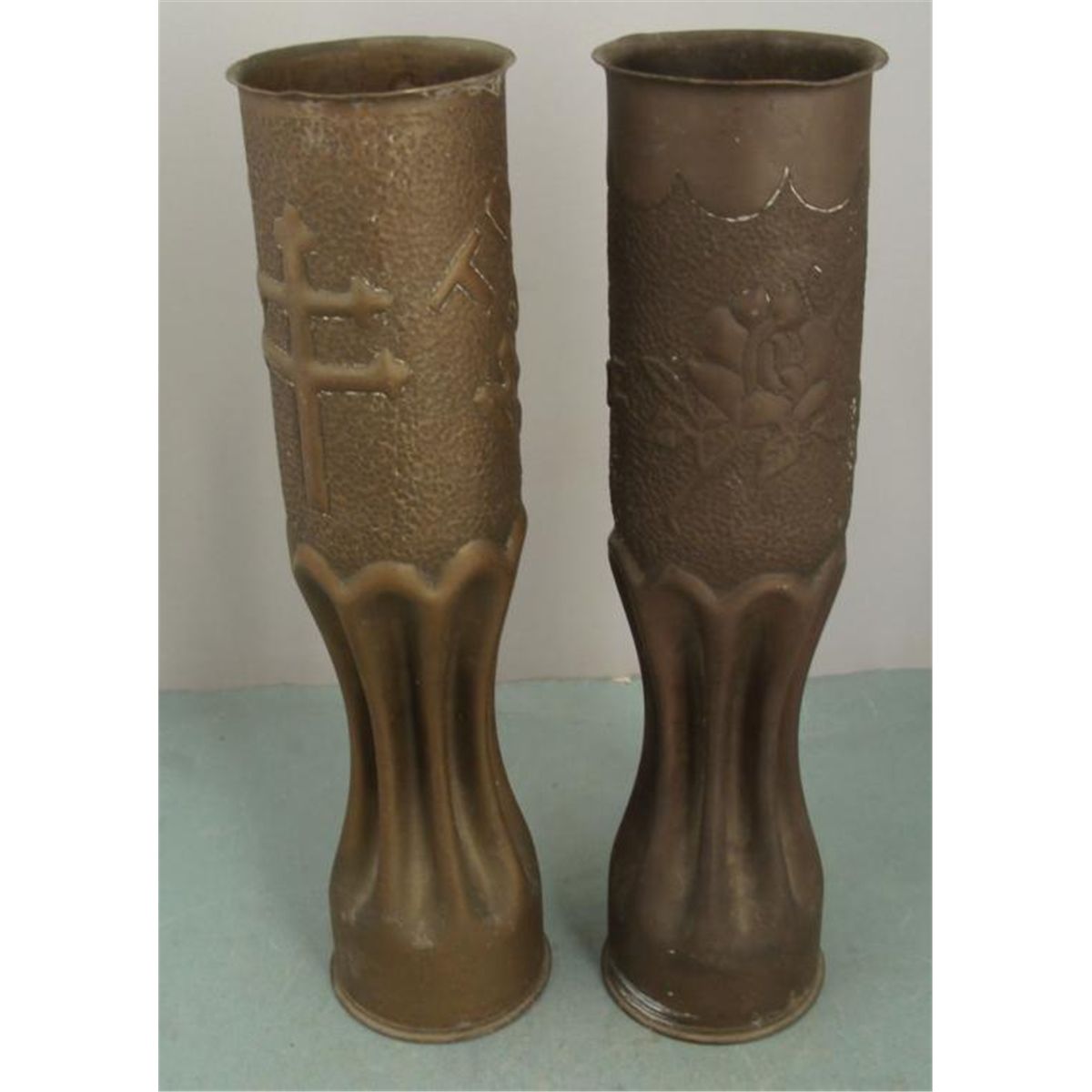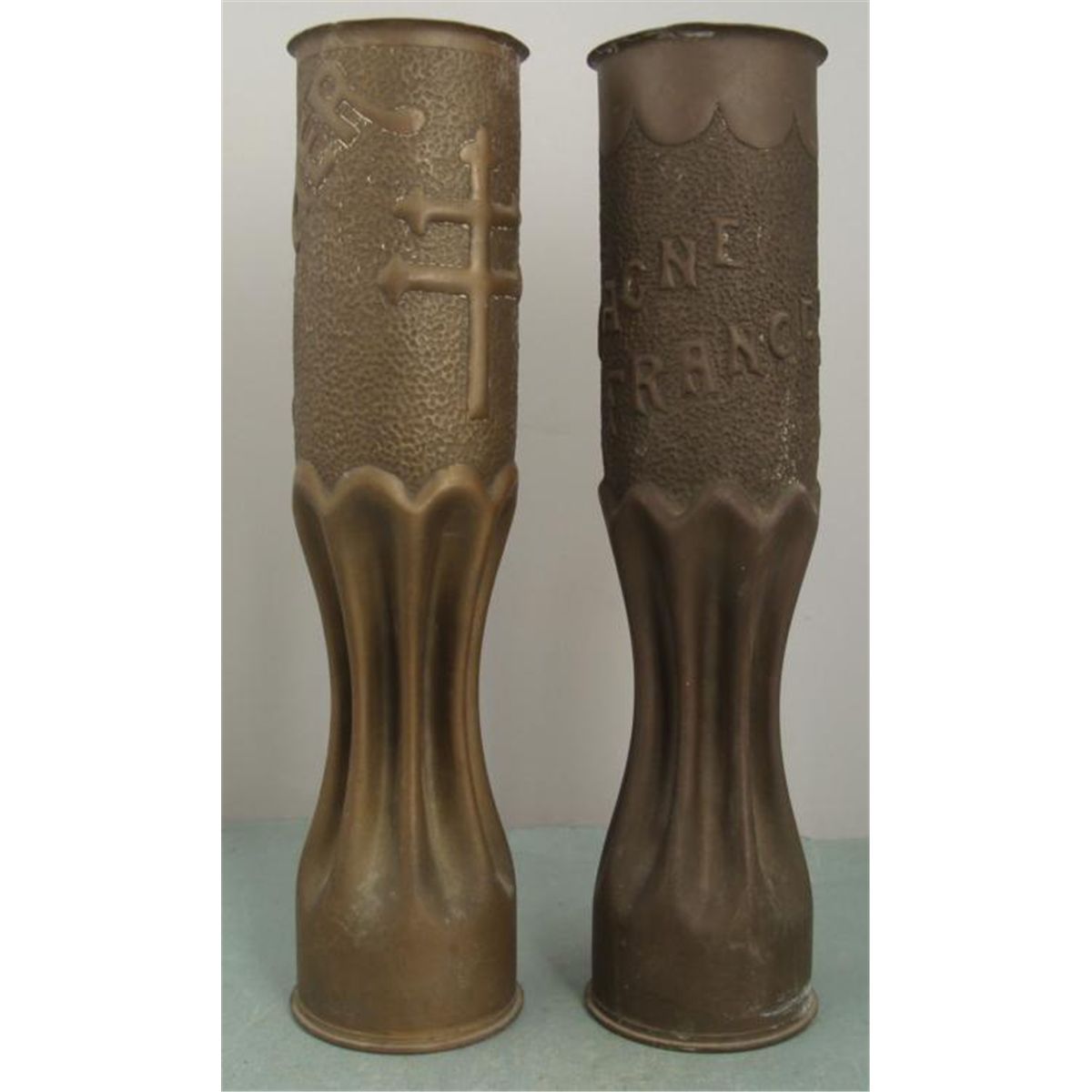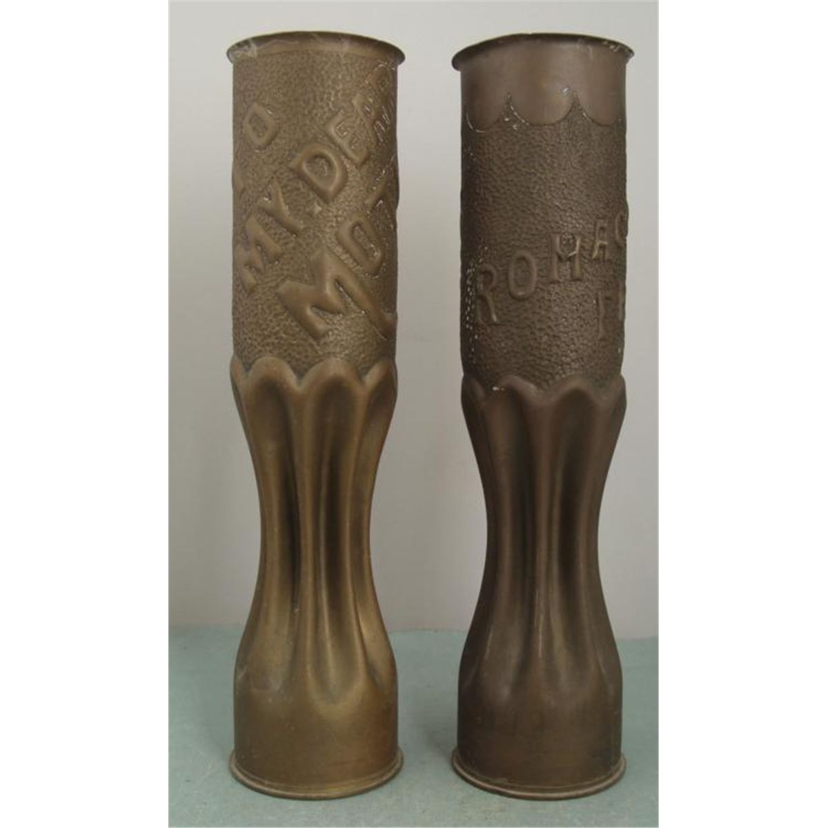 FANTASTIC PAIR OF WWI U.S. DOUGHBOY TRENCH ART-SHELLS-TO MOTHER FROM FRANCE * VERY HARD TO COME BY MILITARIA FROM U.S. WWI U.S. DOUGHBOY--2 PIECES 13 1/2" TALL--TRENCH ART MADE IN THE COMBAT FIELD FROM ARTILLERY SHELLS-BOTTOMS MARKED "75 DEC SC 908L 18 D"--BOTH HAVE FLUTED BOTTOMS--FIRST ART PIECE TOP READS "TO MY DEAR MOTHER" REVERSE HAS THE CROSS OF LORRAINE--HAND KNURLED BACKGROUNG--SECOND READS "ROMAGNE FRANCE AND A ROSE ON THE RECERSE--SCALLOPED TOP DESIGN AND ALSO A KNURLED BACKGROUND--FANTASTIC PAIR SYMBOLIZING LOVE TO A MOTHER FROM THE WWI BATTLEFIELD IN FRANCE BY ONE VERY ARTISTIC GI. *