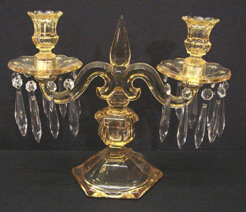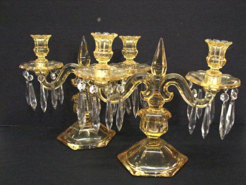PAIR OF YELLOW VASELINE GLASS DOUBLE CANDELABRAS. Each lite has 9 glass prisms. One lite is missing one prism. 10.5" H