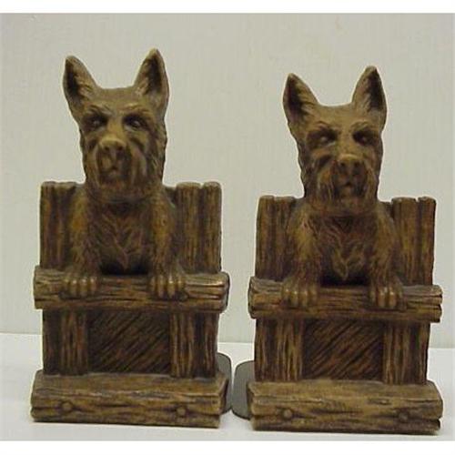 CUTE PAIR OF SCOTTIE DOGS. STANDING OVER THE FENCE, LOVELY OLD BOOKENDS, MADE FROM SOME OLD COMPOSITION TO SIMULATE THE WOOD, AND THE PLATFORMS ARE METAL, EXCELLENT CONDITION,EACH MEASURE ABOUT 7" HIGH, - US BUYER TO PAY 8.00 PLUS INSURANCE.THANKS!