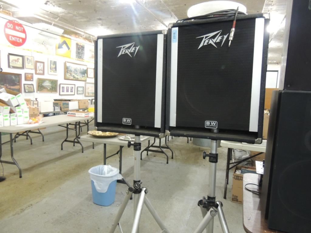 PEAVEY SPEAKERS, BW EQUIPMENT, DJ EQUIPMENT, SOUND EQUIPMENT, STAGE SPEAKERS, PROFESSIONAL SPEAKERS, BAND SPEAKERS, AS SHOWN SEE PHOTO FOR MORE DETAILS.