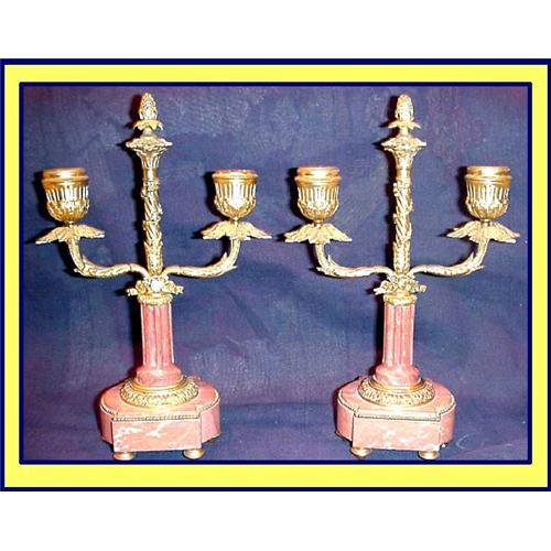 Pair of pink marble and gilt metal candelabra. 19th century, European. <BR>Measure 10inches high.<BR>The shaped rectangular marble base applied with gilt-metal beaded borders and rising up to a fluted column, surmounted by a central foliate, flowerhead and swag decorated stem with bud finial. The sides flanked by two leaf-capped and reeded arms with acanthus leaf-capped and gadrooned candle nozzles, raised on six compressed ball feet.<BR>Condition is very good.No damage or wear of any sort.