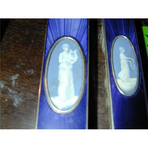 We are privileged to offer a wonderful pair of French sterling brushes 950 quality (with the Head of Minerva and No. 1), covered with blue Chapleve enamel, and each bearing a portrait miniature of a lady. One is playing a lyre, while the other on the smaller brush (measuring 6.5 inches by 1.4 inches) is holding a garland of flowers. Signature looks as though it is " Poler".