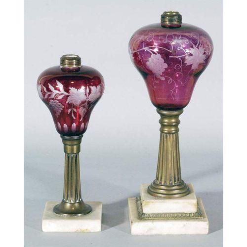 1 PAIR RUBY CUT TO CLEAR FLUID LAMPS 14" high, 19th century, CONDITION REPORT: excellent. PACKING AND SHIPPING (excluding insurance) by Fairfield Auction to points within the Continental U.S.A. and Canada (all other international must be handled by 3rd party shipper) $40.