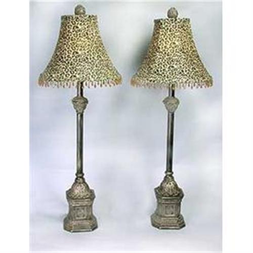 Pair of buffet lamps. Molded resin base. Leopard print silk shades with amber bead trim. Pull chain operation. Accepts one standard base bulb. Bulb not included. Dimensions: 34"h Sjade 12" diam