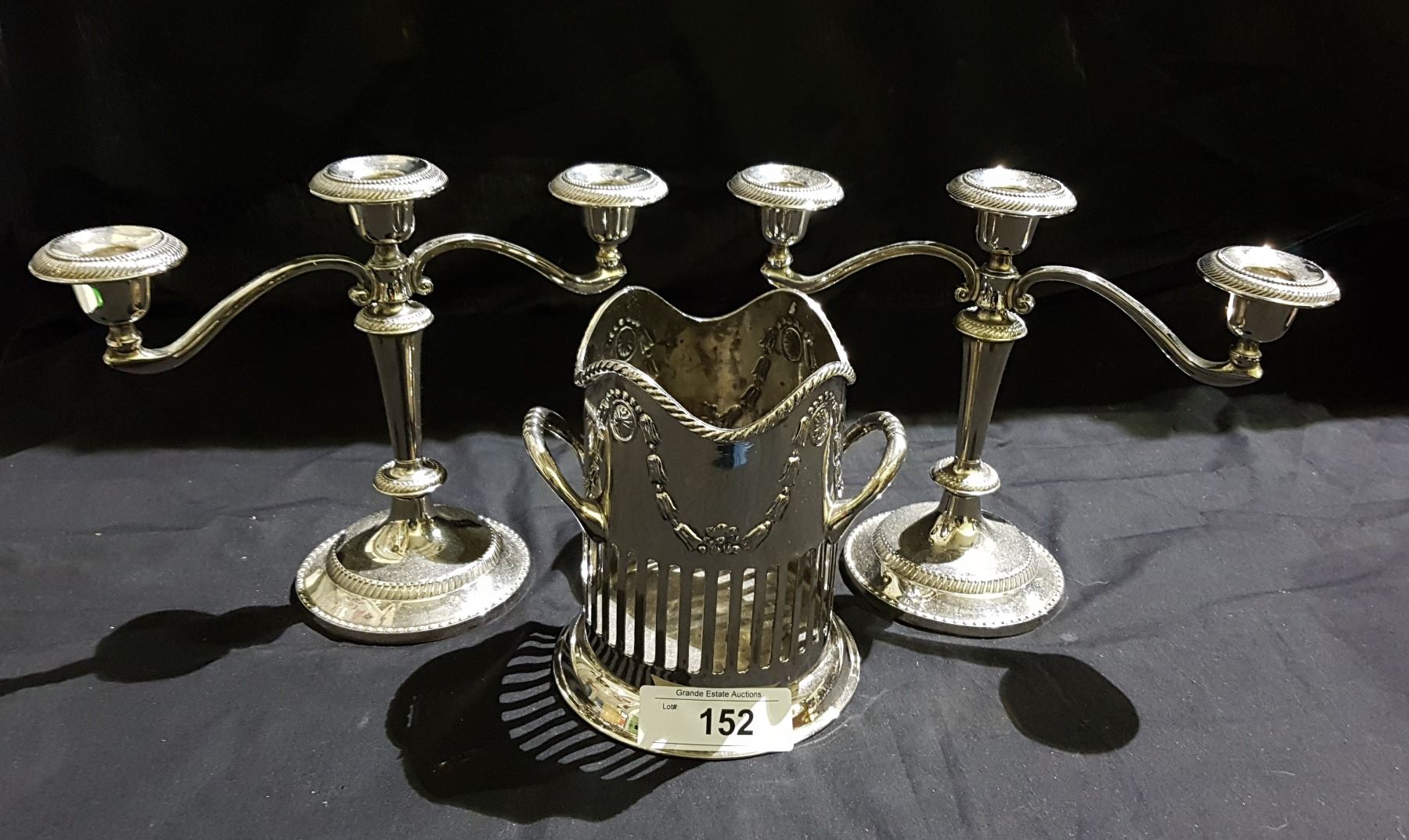 PAIR SILVERPLATE CANDLEBRA & WINE BOTTLE HOLDER