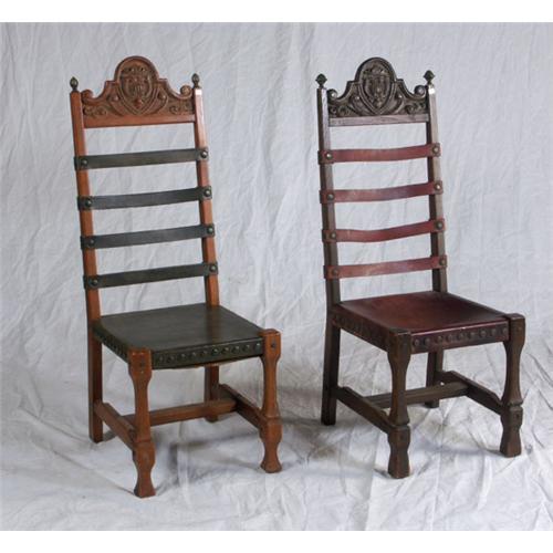 PAIR SIDE CHAIRS: Pair similiar Spanish Colonial style oak side chairs, each with carved crestrail, stiles with brass finials, leather seat and ladder back.