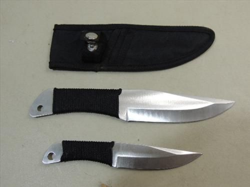 PAIR STAINLESS STEEL THROWING KNIVES & SHEATH. AS SHOWN. VIEW PICTURE FOR DETAIL.