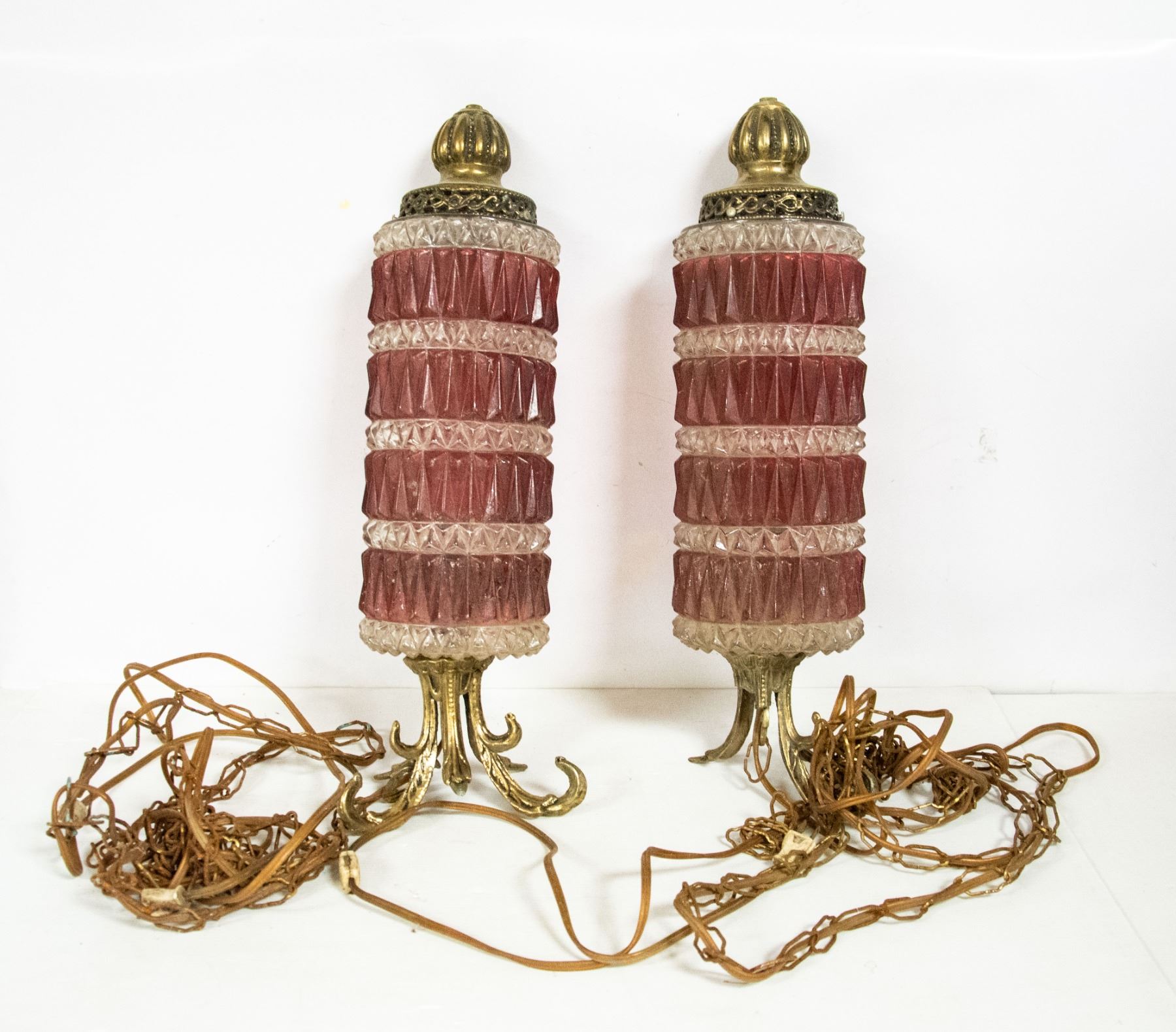 PAIR TALL GLASS HANGING SWAG LAMPS