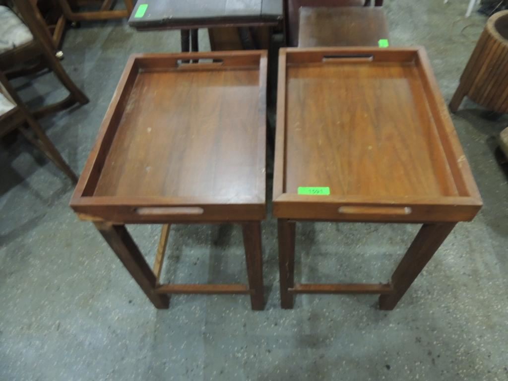 PAIR VINTAGE TRAY SIDE TABLES CONTEMPORARY STYLE TABLES AS SHOWN SEE PHOTO FOR MORE DETAILS.