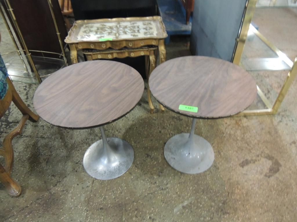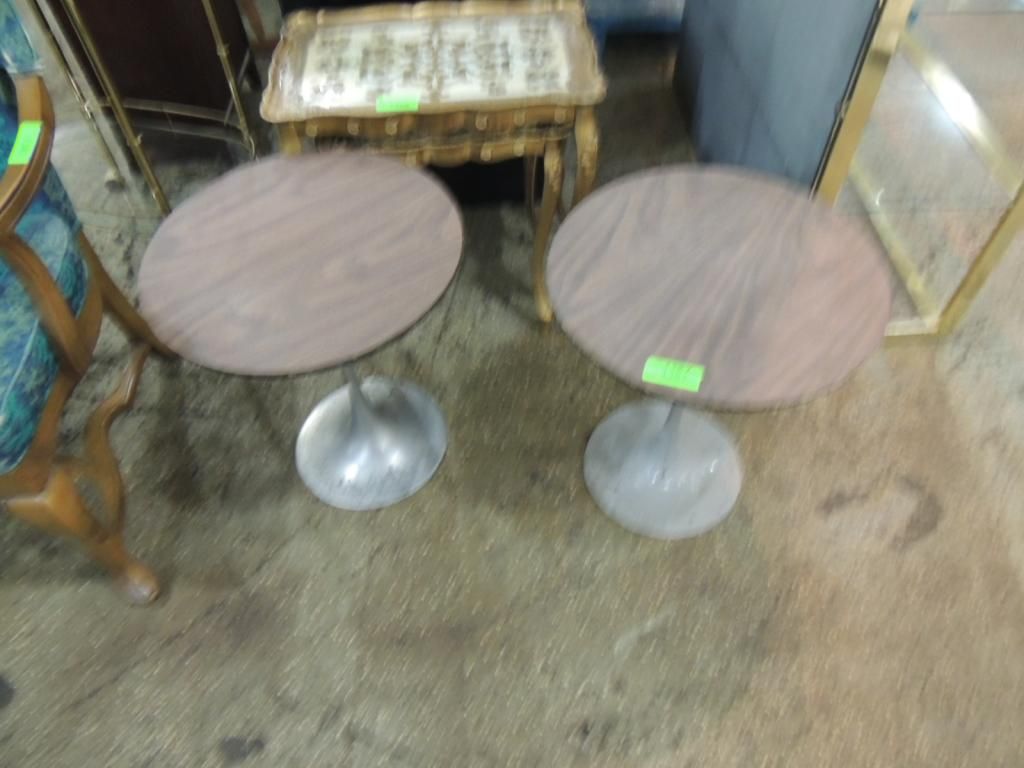 ATOMIC STYLE 1950s SMALL SIDE TABLES ROUND WOODEN TABLES. AS SHOWN SEE PHOTO FOR MORE DETAILS.