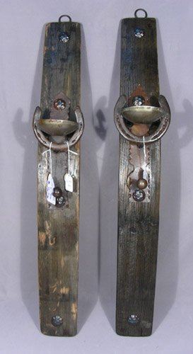 Each candle holder is a curved whiskey slat with heavy metal appointments. 33 1/2" high.