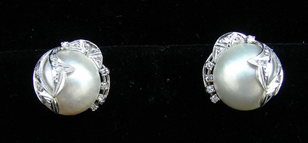 An antique style white gold mount set with a fine mabe pearl with a swirl section of full cut round diamonds. Total diamond weight approx. .35 ct.