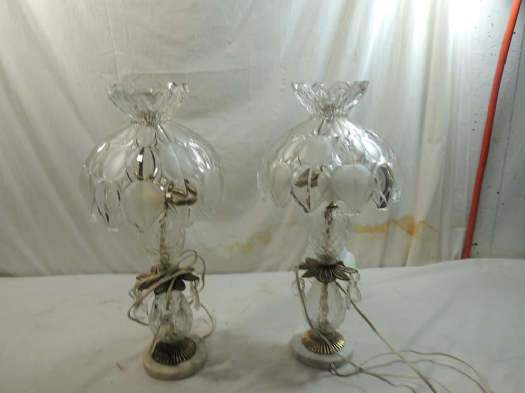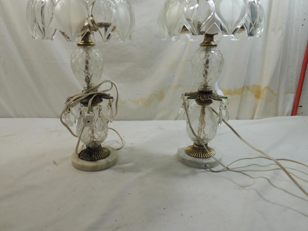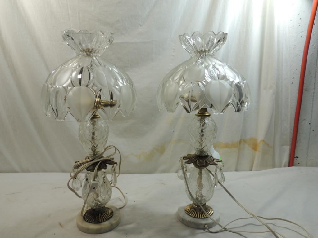GLASS LAMP AND GLASS SHADE, SMALL LAMPS, GLASS & CRYSTAL VINTAGE MARBLE BASE, BEDSIDE LAMPS, AS SHOWN SEE PHOTO FOR MORE DETAILS.