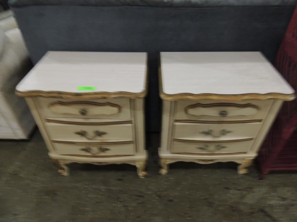 CREAM AND GOLD TONE DETAIL VINTAGE BEDROOM NIGHT STANDS, DRAWERS AS SHOWN SEE PHOTO FOR MORE DETAILS.