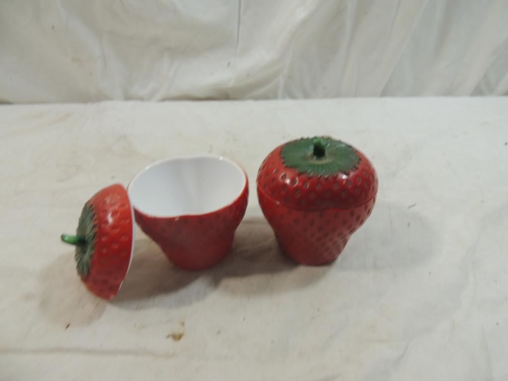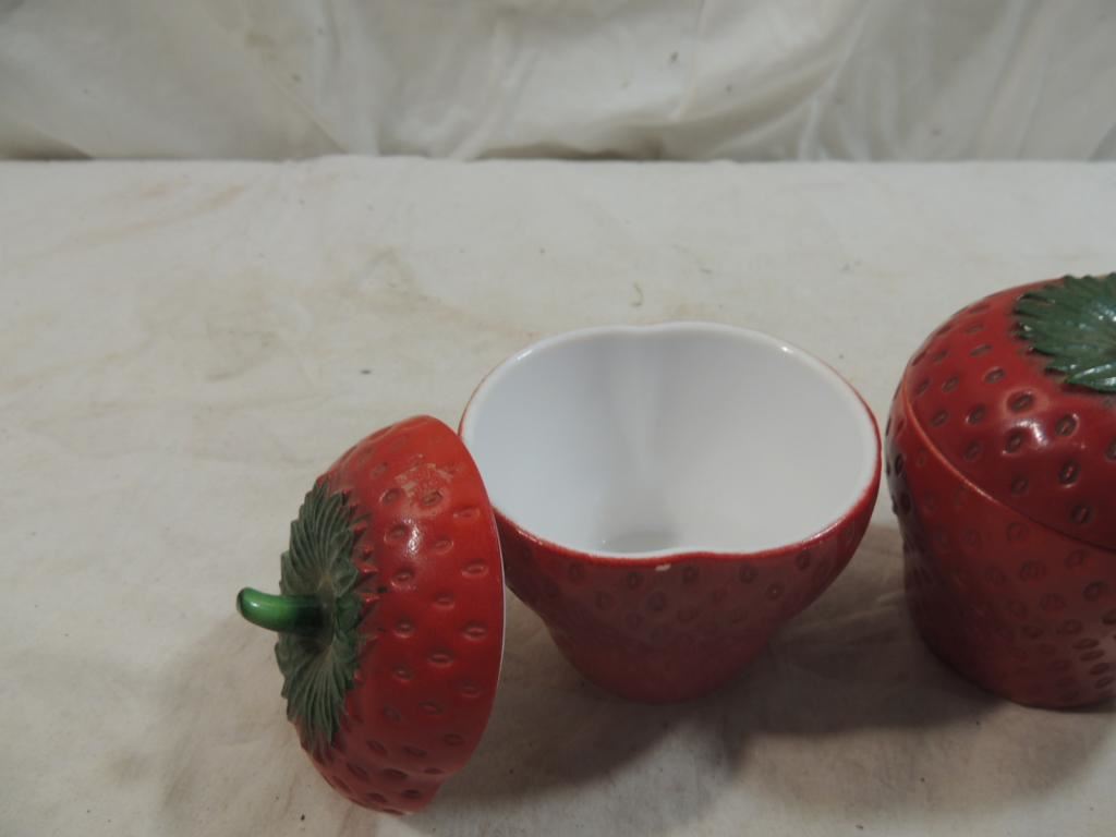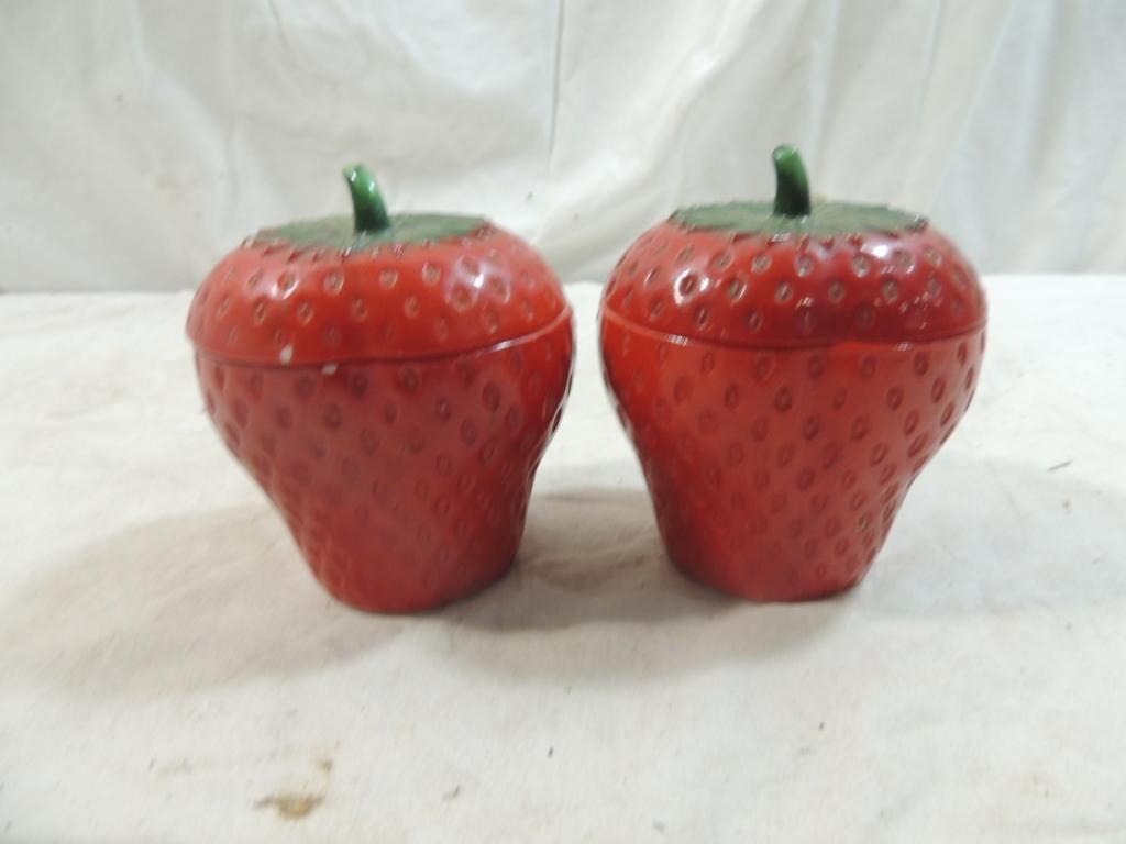 PAIR VINTAGE STRAWBERRY COVERED JARS, JAM MARMALAID JARS, DECORATIVE MILK GLASS JARS AS SHOWN SEE PHOTO FOR MORE DETAILS.