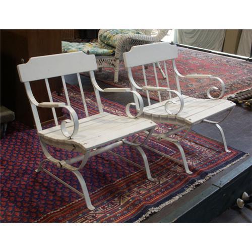 BOAT CHAIRS: Pair vintage boat chairs, white painted wood and metal, brass crestrail finials.