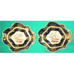 PAIR WORCESTER HANDLED TRAYS - Painted porcelain, decorated with birds, cobalt and gilt border, openwork foliate handles; minor gilt loss. L-10", VG. Est. 100-200
