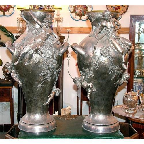 Description: Fantastic PAIR of huge lovely white metal flower vases , original Art Nouveau period , crafted with the finest detail , in very good conditions, with just a few small non significant chips,, this PAIR is unique, we have been searching hours without finding even a similar quality item.