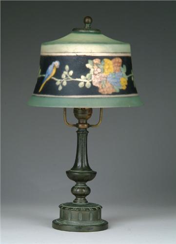 PAIRPOINT BOUDOIR LAMP. Very nice Exeter shade is decorated with parrots and floral panel all against a black background bordered by green. Signed on the inside edge in gold "Pairpoint Corp'n". Shade rests atop original Pairpoint base with fluted column. Base is signed with diamond mark and "D3061". SIZE: Shade is 8-1/4 in. dia. Overall height is 15 in. CONDITION: Repaired chip to bottom rim of shade, otherwise very good. 5-60997