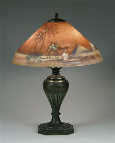 PAIRPOINT GARDEN ALLAH LAMP. Pairpoint table lamp has reverse painted Carlisle shade with of Garden of Allah scene depicting pyramids, ruins, palm trees and Arab with camel. Shade rests atop a Pairpoint base with low relief flower basket designs. Shade is unsigned. Base is marked "Pairpoint D3054 Made in USA". SIZE: Shade is 17-1/2 in. dia. Overall height is 22-1/2 in. CONDITION: Shade has two pieces of glass, approx. 1-1/2 in. x 1-1/2 in. each, which have broken out of top rim and have been glued back in place. Base has replaced sockets and has been rewired. Estate of Edwin Schiebel Sr. 5-60014