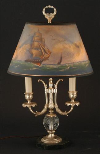 "PAIRPOINT NAUTICAL LAMP with reverse painted shade 16"" diameter, artist signed C. Durand shade, silverplated base, excellent "