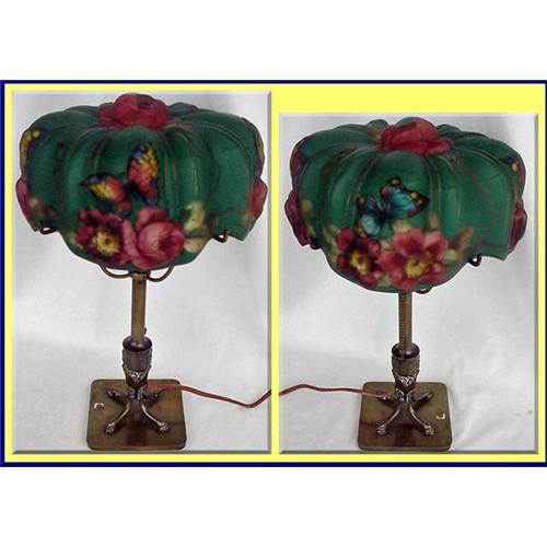 <BR>SHADE: shaped and rounded square shape, fluted and folded with a satiny finish. Beautifully blown <BR><BR>roses in full bloom and in bud surround the base. Each corner has a butterfly flitting on or <BR><BR>above the roses. Reverse painted with fine detail. The shade dips at the apex on which sits <BR><BR>another wonderfully moulded pink rose. Ground colour is forest green which shows off the pinks <BR><BR>and reds beautifully. Gilt highlights on some folds.