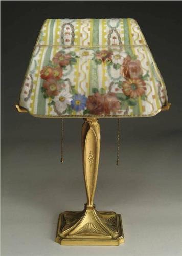 PAIRPOINT PUFFY TABLE LAMP. Ravenna shade with garlands of flowers including roses, pansies and dogwood on a busy quilted background. A colorful and pretty example. Gilded lines on exterior of shade. The square bottom base with raised stylized floral decoration. Shade is signed "The Pairpoint Corp." on inside of lower rim. Base is signed "PAIRPOINT MF'G CO." "B3020" together with a "P" in a diamond. SIZE: 14" sq. shade sits on 18" arms. Overall height is 22". CONDITION: Shade is very good to excellent. Wear to gild on base. Crack to 1-1/2" shaft below socket cluster. 5-61648