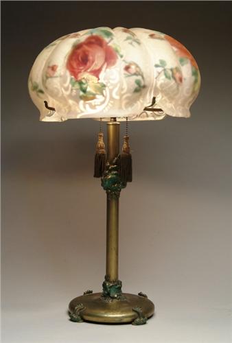 PAIRPOINT ROSE LAMP. Fantastic Pairpoint lamp has large Venice shade decorated with beautiful reverse painted red roses, buds and green leaves against a cream background. Shade rests on signed "Pairpoint" base with four applied feet and molded roses on stem. SIZE: Shade is 12 in. dia. Overall height is 24 in. CONDITION: Some discoloration to base, otherwise very good to excellent. 5-61578