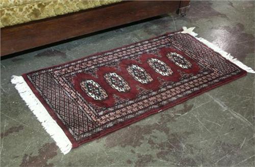 CARPET: Pakistan Bokhara carpet of hand knotted wool woven on a cotton warp measuring approximately 4.3 x 2.1, allover pattern, red color