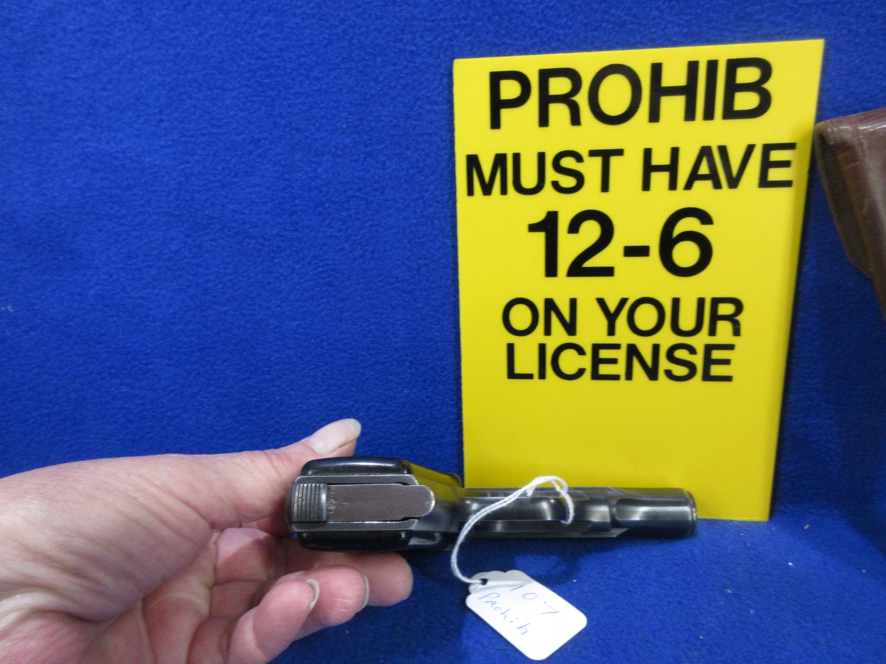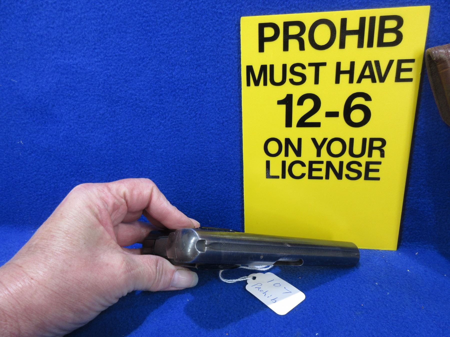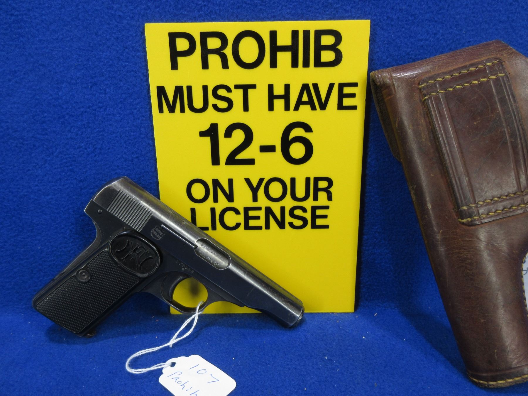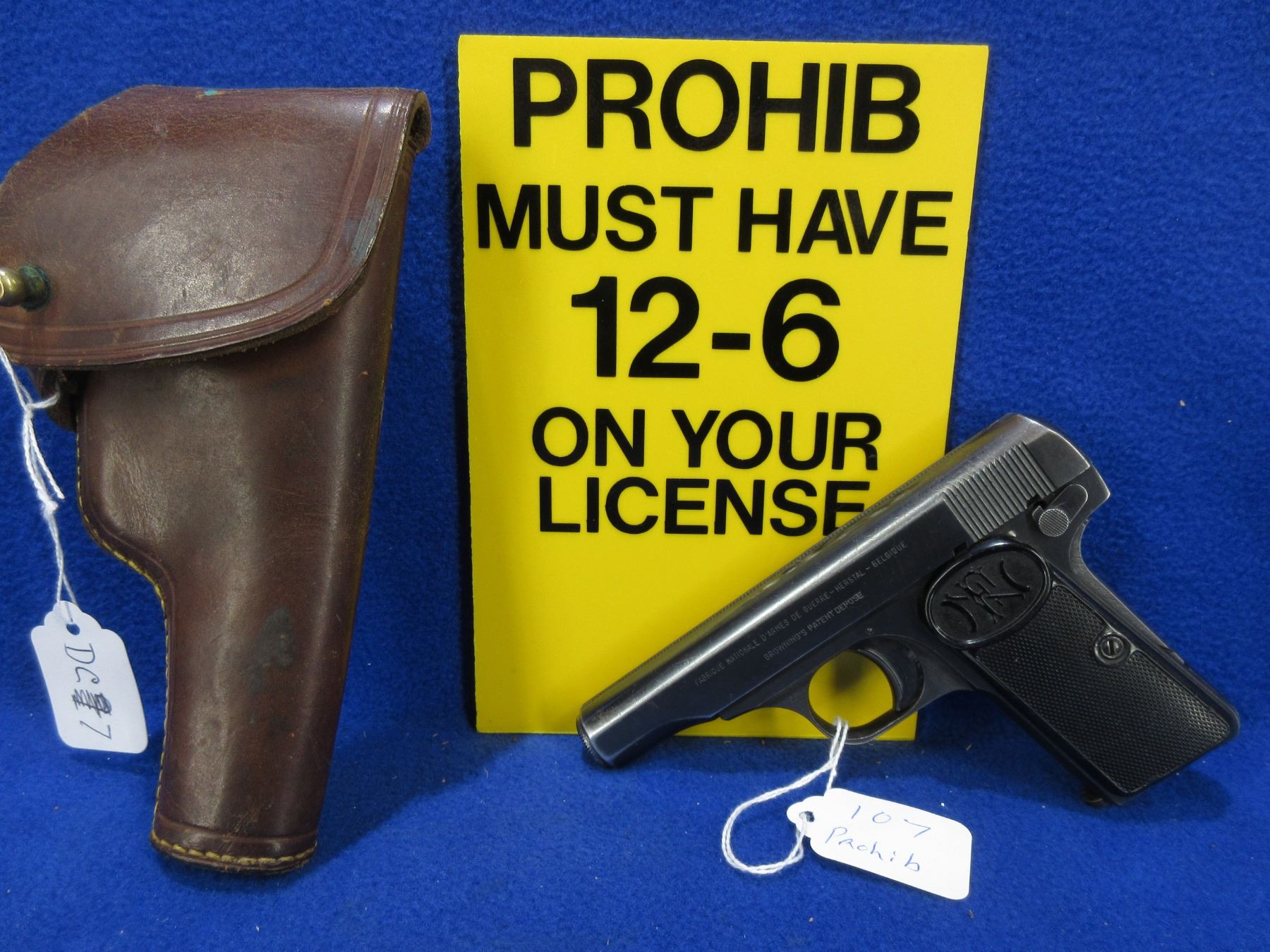PAL must have 12-6 Handgun on it to Purchase this Prohib Firearm CHECK BEFORE BIDDING - Browning 1910-FN in 7.65MM - This semi-auto pistol with magazine appears to be in good to very good working order. Barrel is 87MM, rifling is good to very good, bluing is good, has fixed sights, synthetic grips are good to very good, comes with leather holster. Ser # 579058