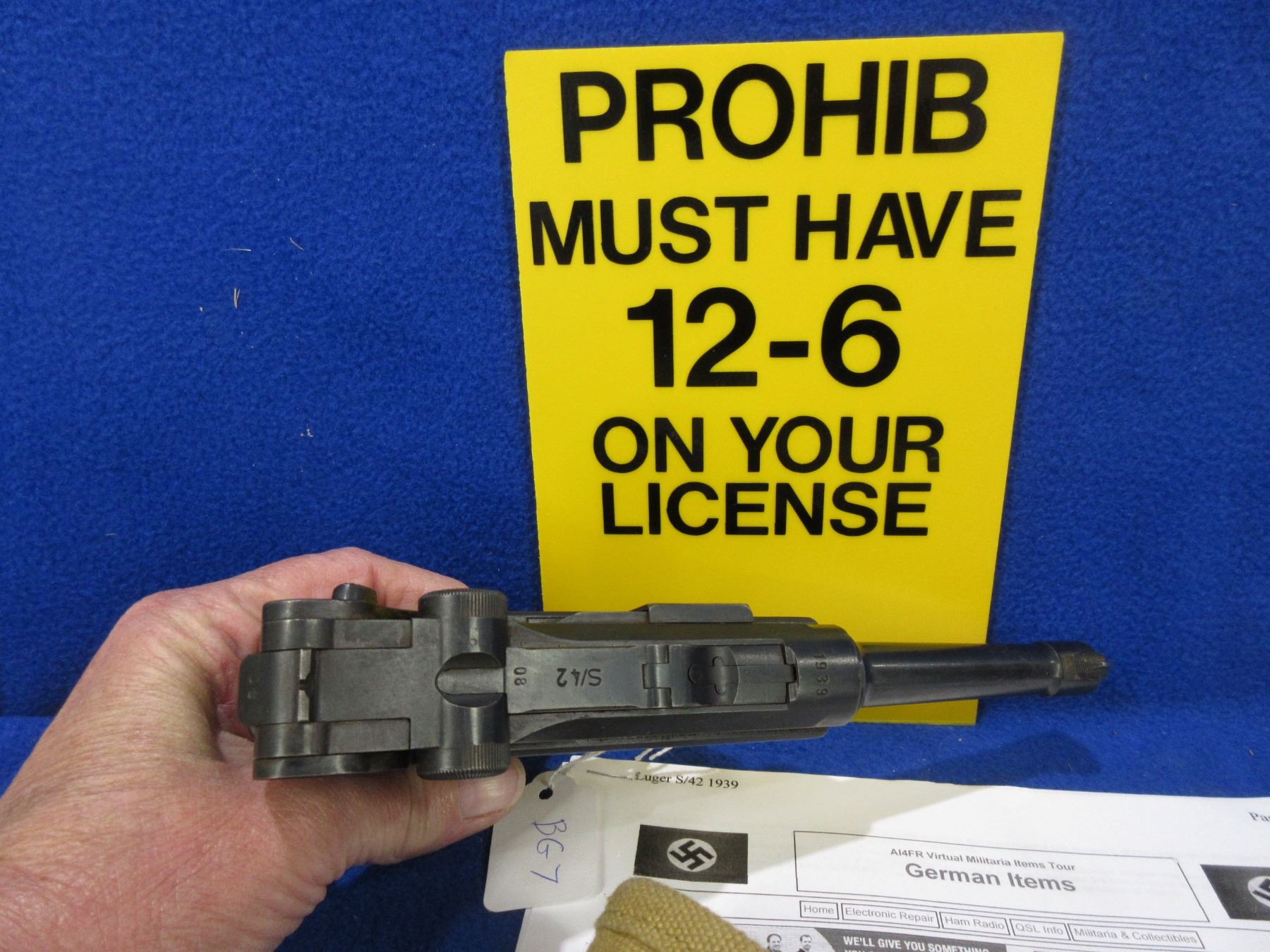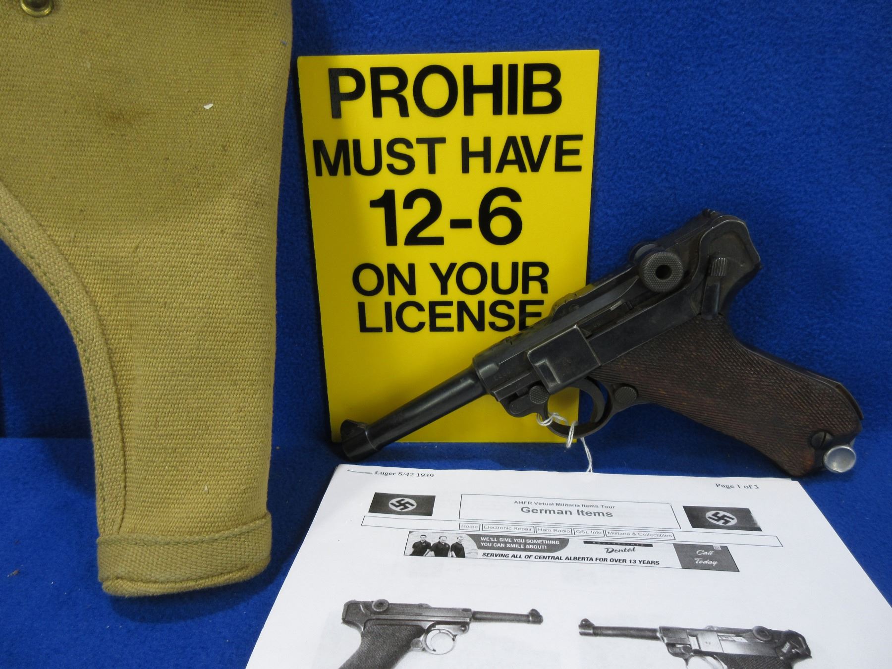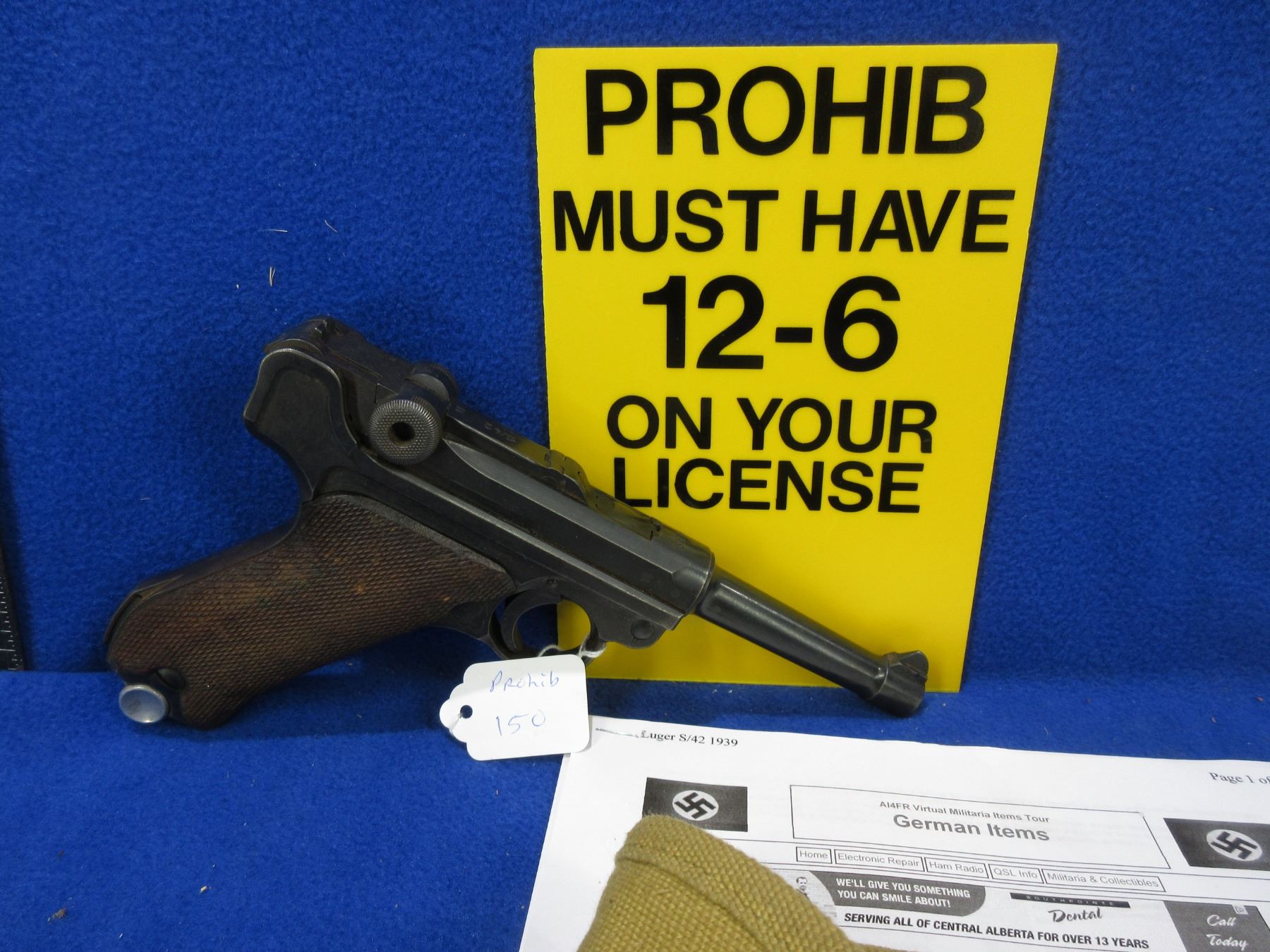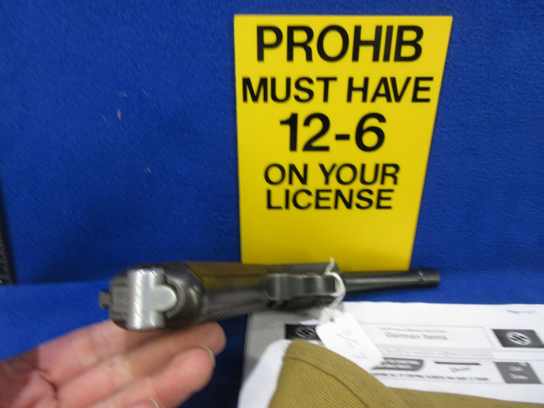 PAL must have 12-6 Handgun on it to Purchase this Prohib Firearm CHECK BEFORE BIDDING - Luger in 9MM - This semi-auto pistol with magazine appears to be in good to very good working order. Barrel is 102MM, rifling is good, bluing is good to very good, has fixed sights, grips are good, comes with a canvas case. Ser # 6808N