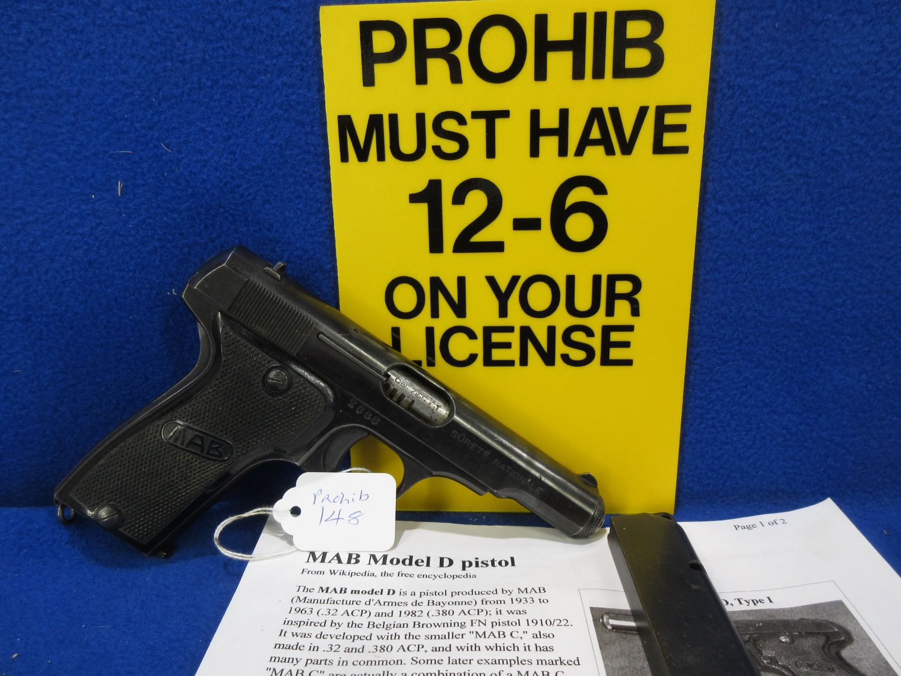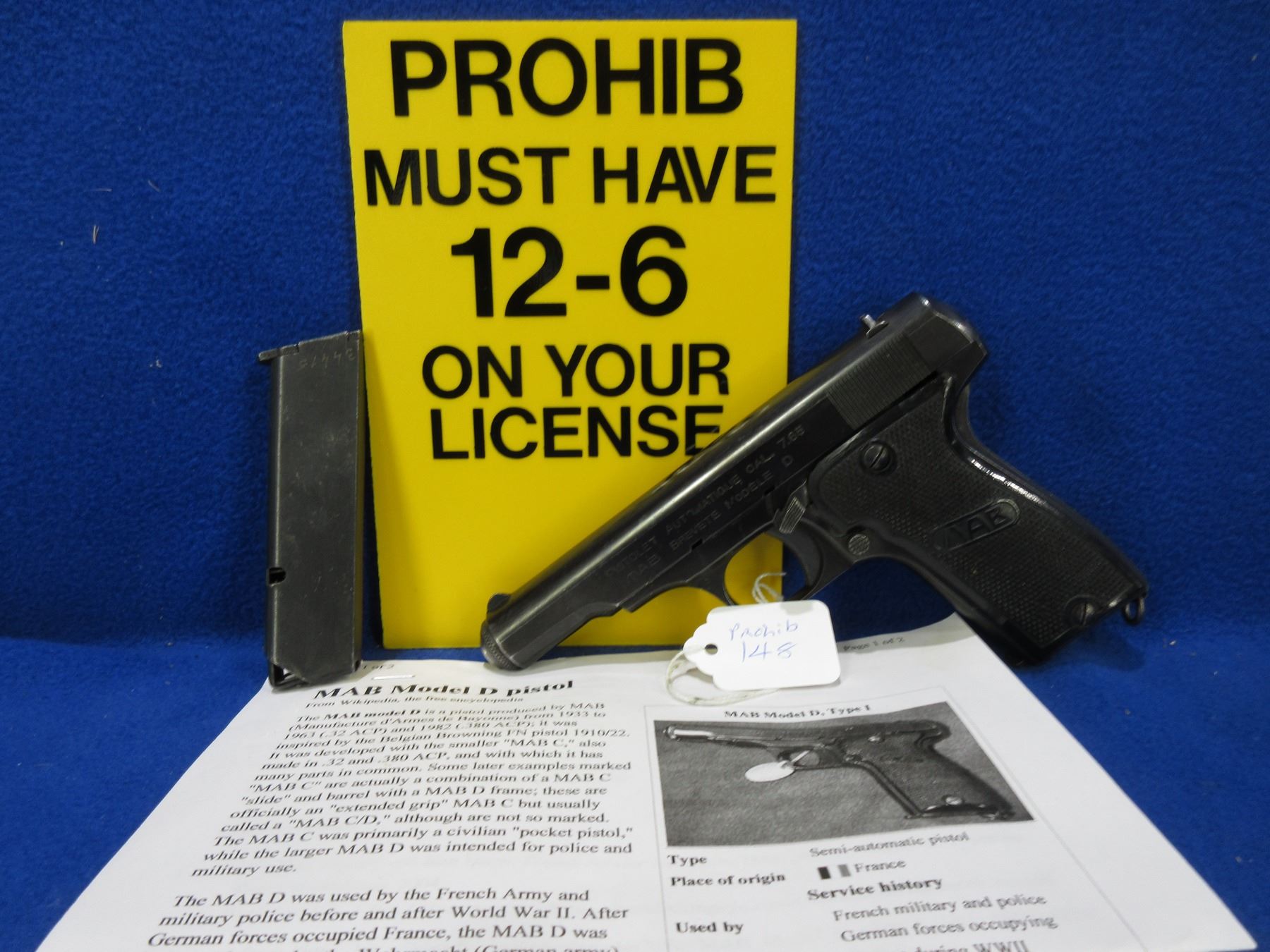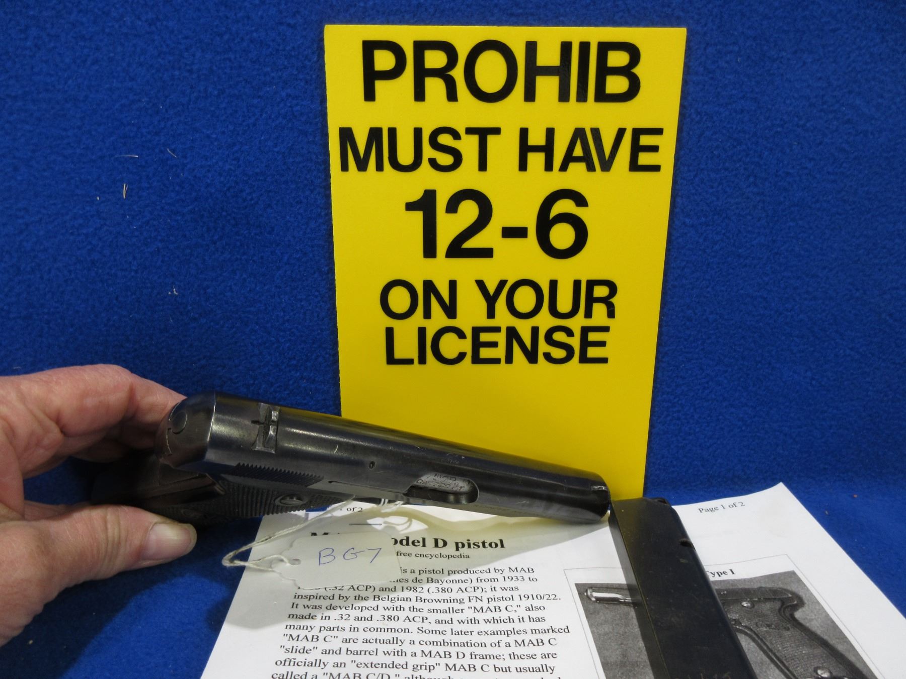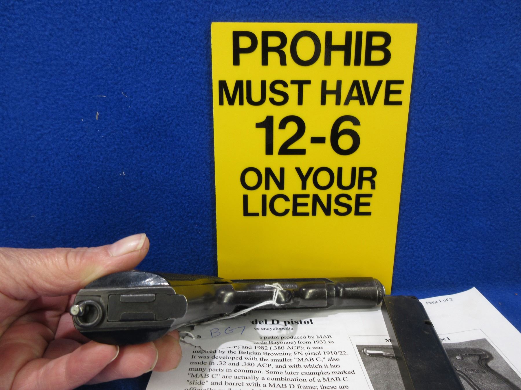 PAL must have 12-6 Handgun on it to Purchase this Prohib Firearm CHECK BEFORE BIDDING - M.A.B. Model D in 7.65MM Cal. - This semi-auto pistol with 2 magazines appears to be in good to very good working order. Barrel is 102MM, rifling is good to very good, bluing is good to very good, has fixed front sight, adjustable rear sight, grips are good to very good. Ser # 2685