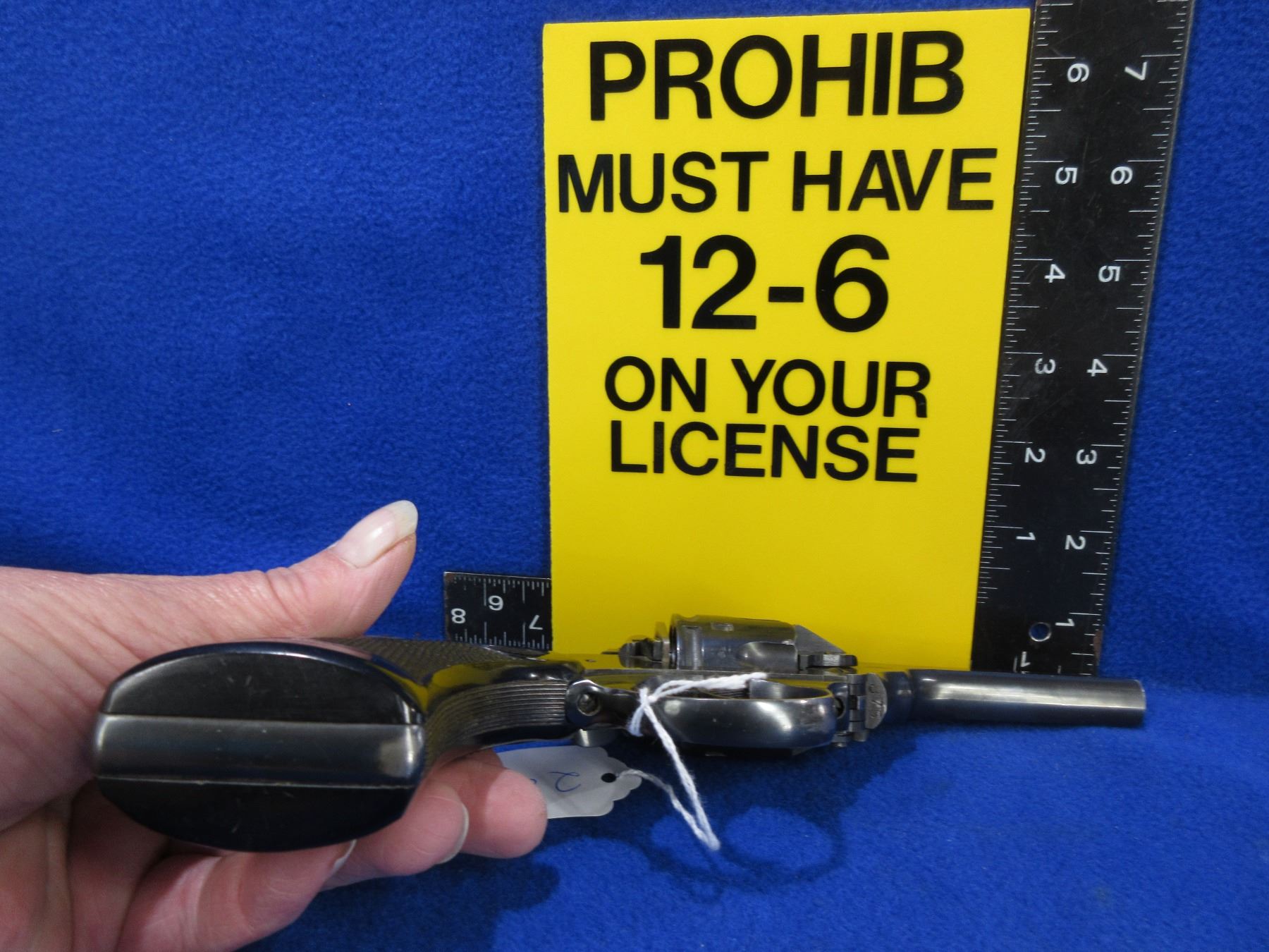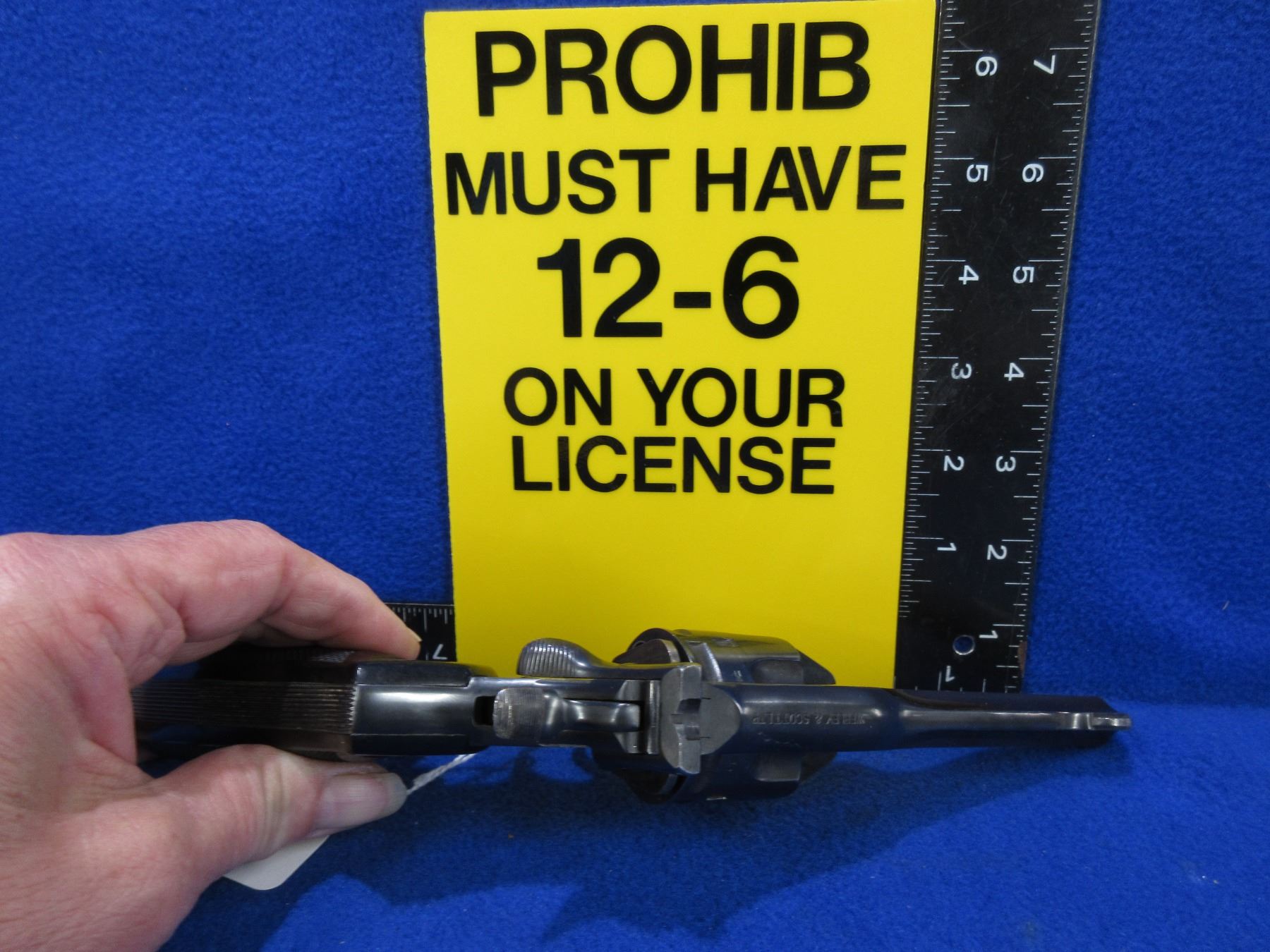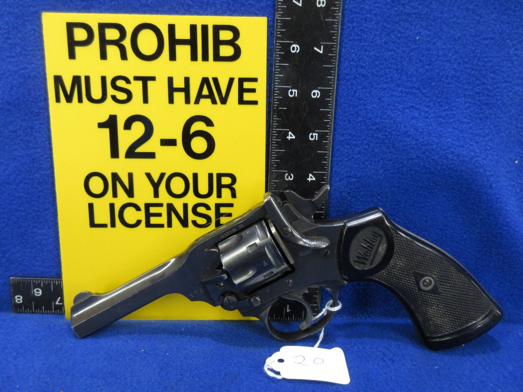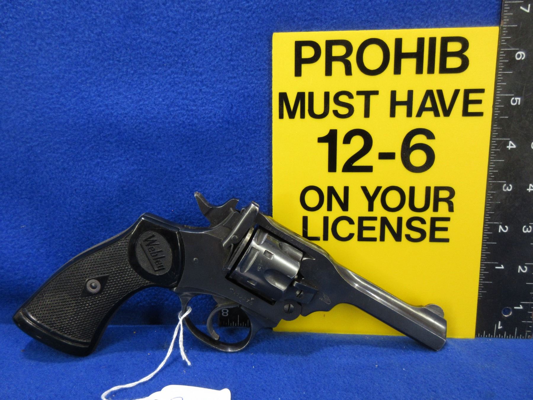 PAL must have 12-6 Handgun on it to Purchase this Prohib Firearm CHECK BEFORE BIDDING --Webley Mark IV Police/Military in 38 S&W - This 6 shot double action revolver appears to be in good to very good working order. Barrel is 102MM, rifling is good to very good, bluing is good to very good, has fixed sights, synthetic grips are good to very good. Ser # A10875
