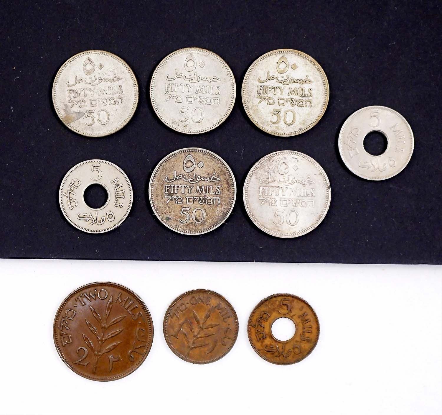 1 x 1941 Mil XF, 1 x 1927 2 Mils UNC, 1 x 1935 5 Mils VF, 1 x 1942 5 Mils bronze KM # 3a VF, 1 x 1946 5 Mils VF, 2 x 1927 50 Mils Fine and VF, 1 x 1935 50 Mils Fine, 1 x 1939 50 Mils in EF and 1 x 1942 50 Mils in Fine.