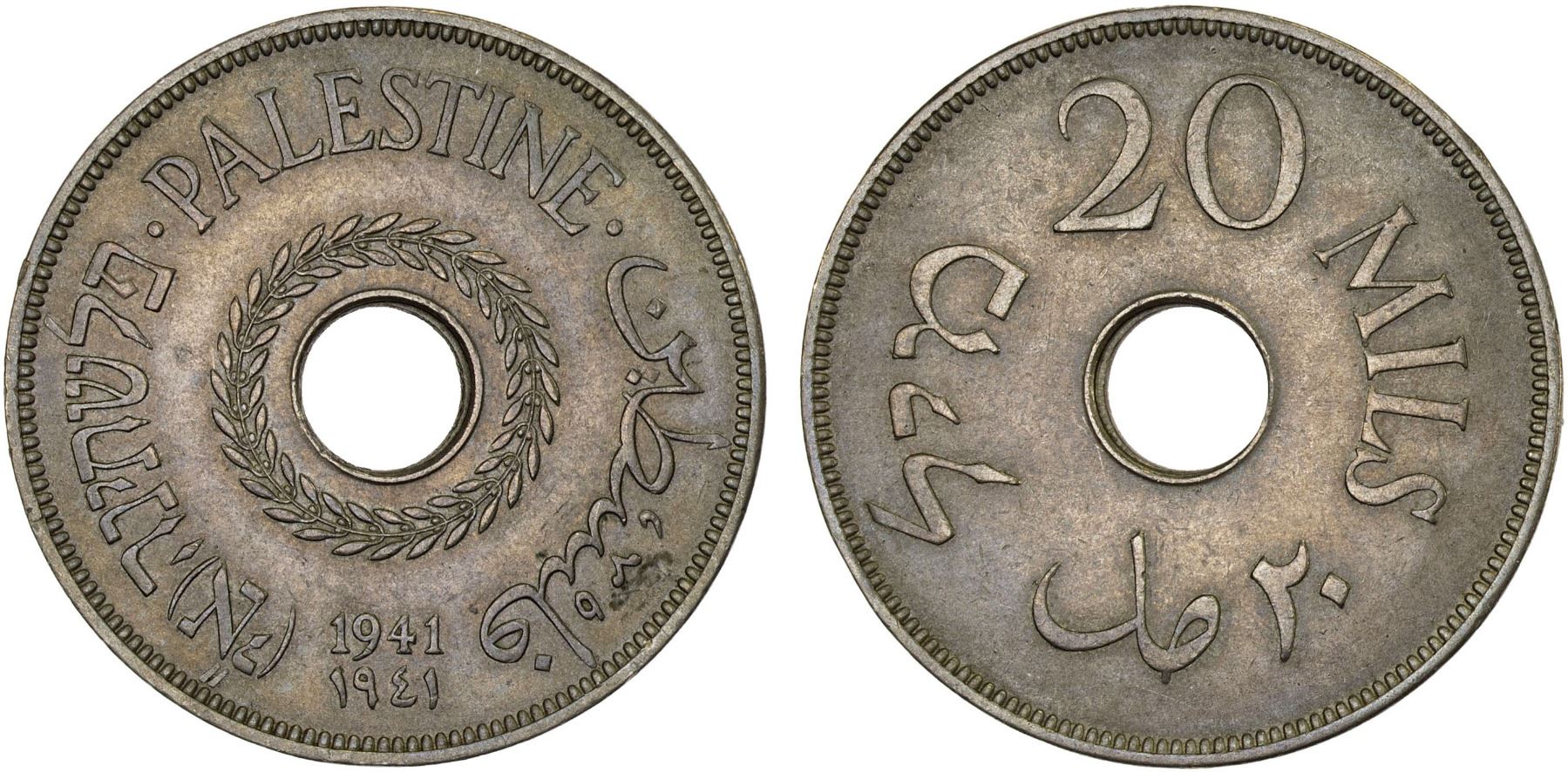 PALESTINE: British Mandate, 20 mils, 1941, KM-5, key date, VF-XF, ex Almer H. Orr III Collection.