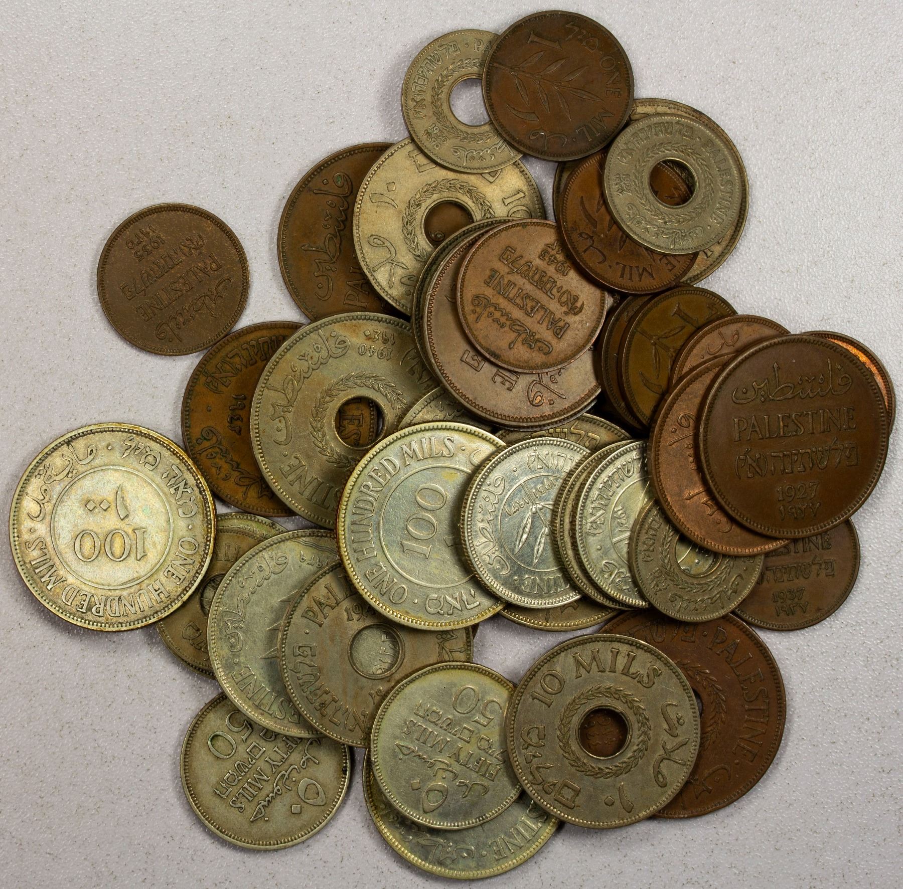 PALESTINE: British Mandate, LOT of 41 coins, including 5 AR 100 mils, 6 AR 50 mils, 3 20 mils, 7 10 mils, 6 mils, 4 2 mils, and 10 1 mil, no duplicate dates; most in EF conditions, a few AU to near Unc; retail value $300, lot of 41 pieces.