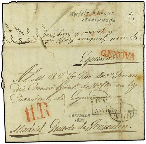 1835 (April 23) Entire letter from Spanish Missionary in Jerusalem to Madrid, sent via Semlin with black Disinfection cachet; thence across Italy to Genoa with two line manuscript Forwarding Agent´s notation. Struck with red ´Genova´ and thence via France with framed ´Italie/Par/Antibes´ in black. Charged ´11R´ due in red on arrival. Slight tear to face panel but very rare.