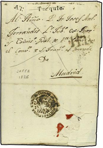 1826 (March 3) Entire letter written by Spanish Missionary from Jaffa to Madrid, mailed probably via Constantinople and through Semlin with superb strike of circular Disinfection cachet in black displaying well on reverse; and letter spiked against cholera. Black straight line ´Turquie´ and ´AT´ on front and charged with handstruck ´11R´ due on receipt. A remarkable and extremely rare entire to a most unusual destination.