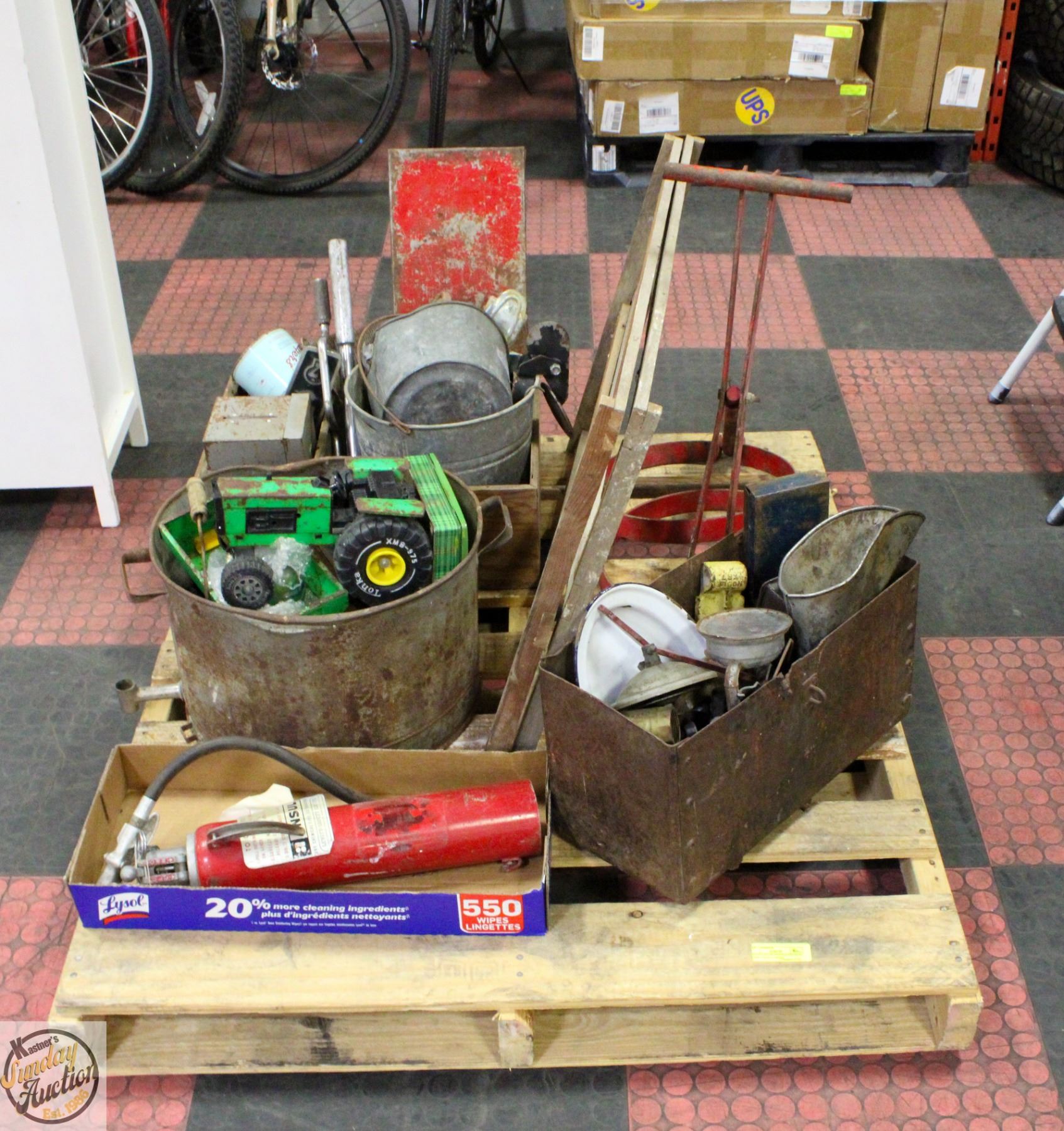 PALLET LOT OF VINTAGE/ANTIQUE FARM COLLECTABLES,