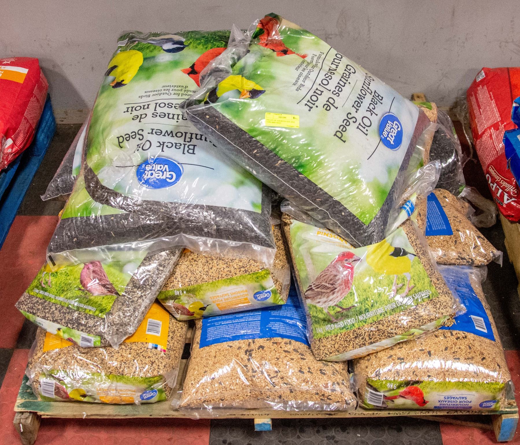 PALLET OF ASSORTED SIZE AND TYPE BIRD SEED.