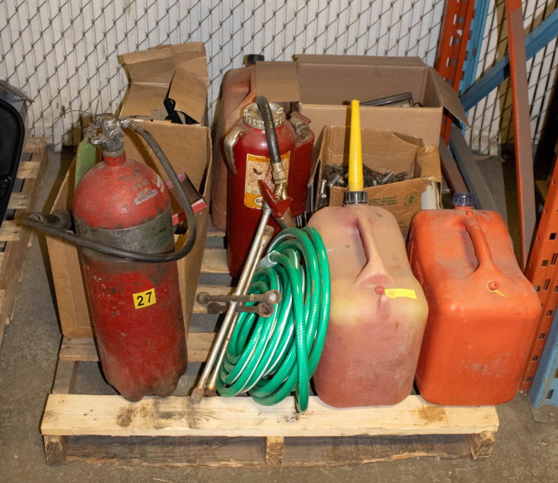 JERRY CANS, 2 FULL FIRE EXTINGUISHERS, NEW GARDEN HOSE, TREE STAND WITH LEGS, APPROX 20LBS OF ASSORTED BOLTS & OIL FILLED HEATER. **PALLET MUST BE REMOVED BY WEDNESDAY AT 5PM** **ALL ITEMS MUST BE REMOVED BY 5PM SATURDAY, DECEMBER 30TH 2023. ALL REMAINING ITEMS WILL BE SUBJECT TO A $6.00 PER DAY STORAGE CHARGE. ANY ITEMS REMAINING AFTER MONDAY, JANUARY 8TH, 2023 WILL BE CONSIDERED FORFEITED. NO REFUNDS WILL BE ISSUED FOR FORFEITED ITEMS. TO SCHEDULE A PICK UP APPOINTMENT CLICK HERE