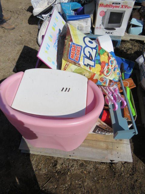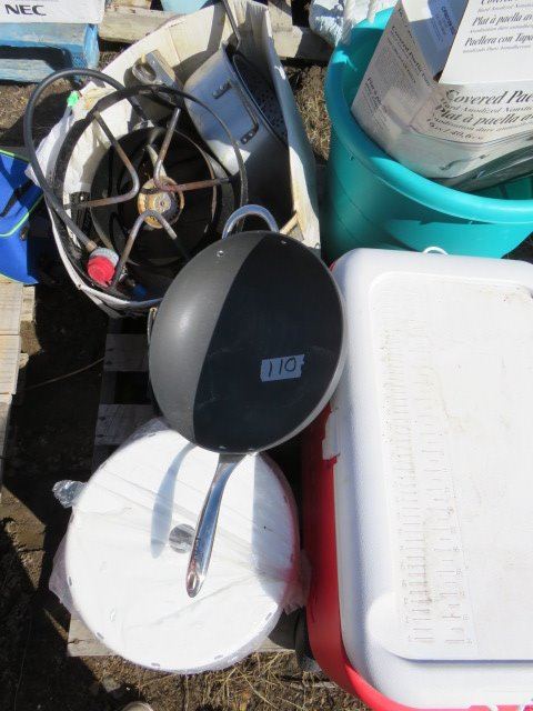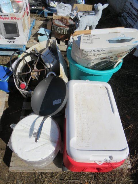 PALLET OF MISC CAMPING ITEMS (PICNIC COOLER, PROPANE BURNER, TUBS, ETC)