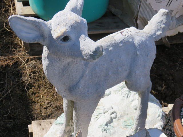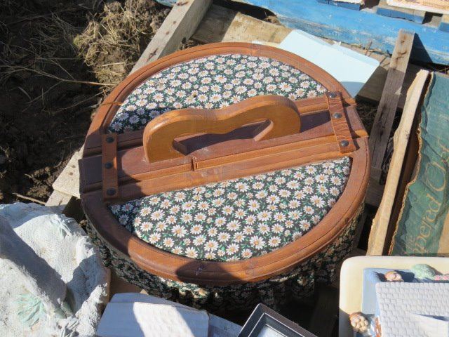 PALLET OF MISC HOUSEHOLD ITEMS (LAWN ORNAMENTS, SEWING BASKET, GLASS, ETC)