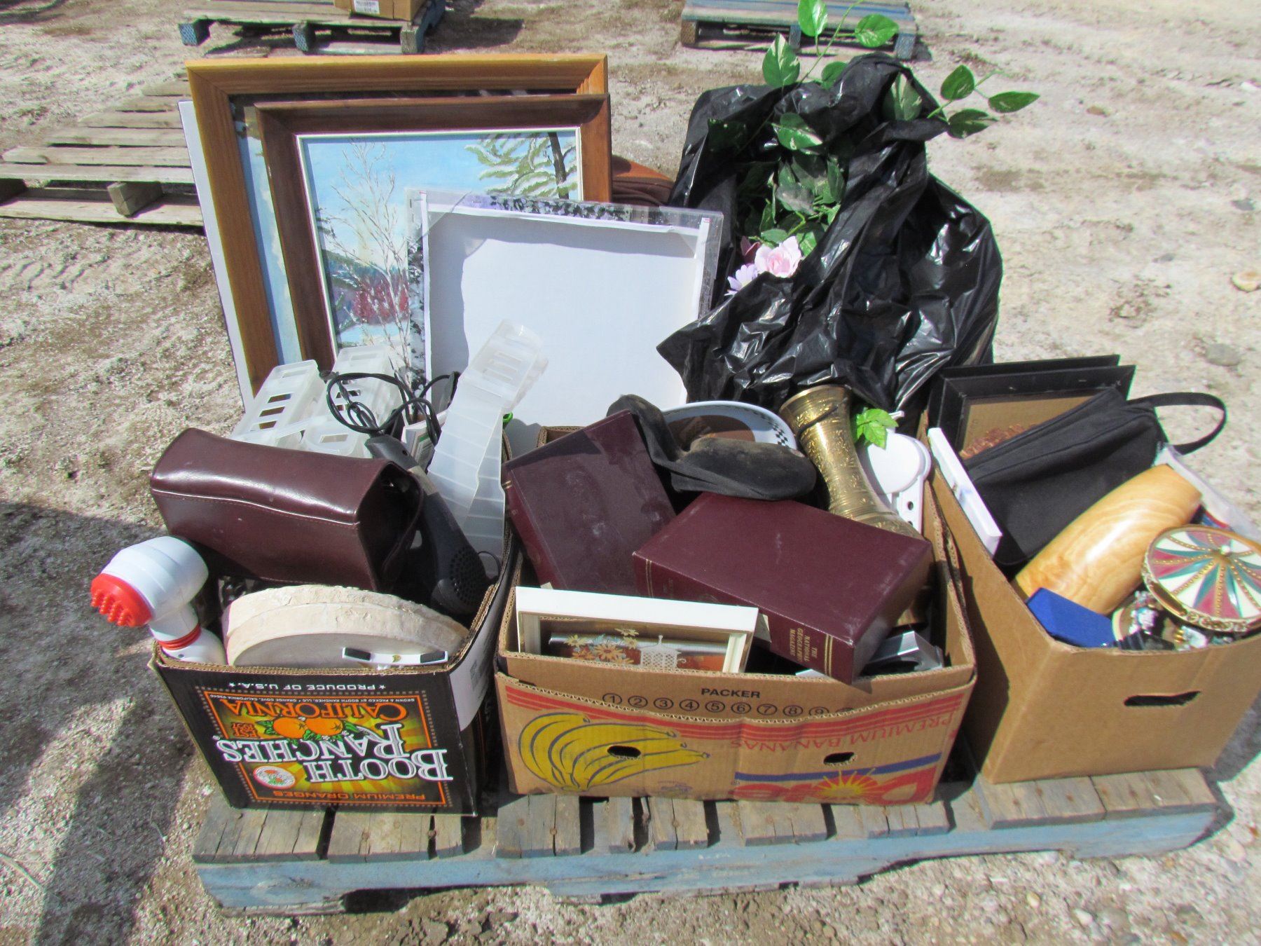 PALLET OF MISC (LUGGAGE, KNICK KNACKS, PICTURES, ETC)