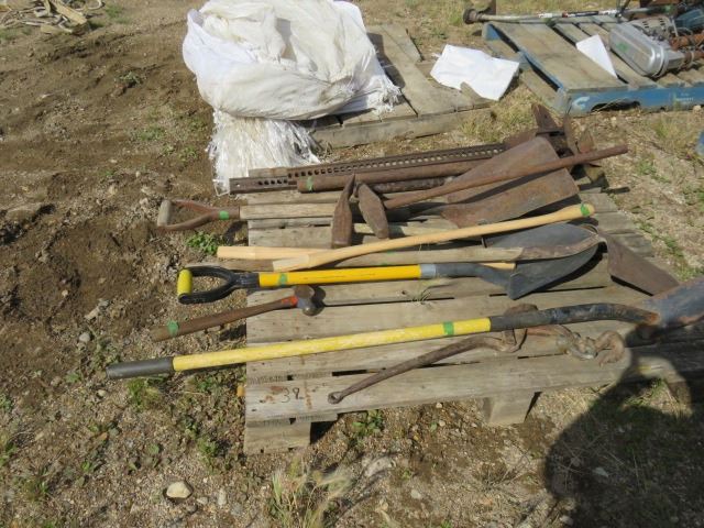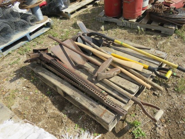 PALLET OF SHOVELS, SLEDGE & AXE HANDLES & 2 JACK ALLS