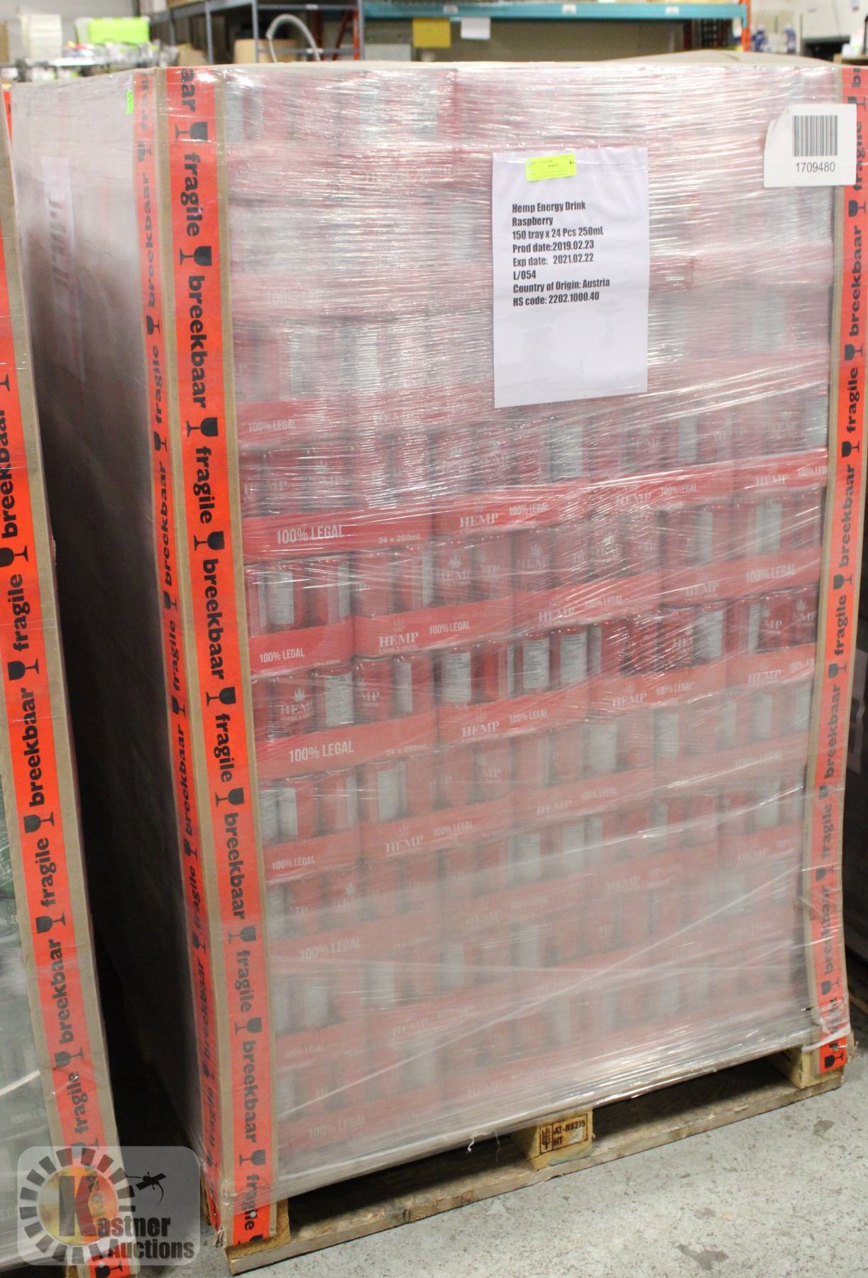 DRINK, EACH CASE HAS 24 CANS = 3600 CANS. BEST BEFORE FEB 2021. MUST BE REMOVED BY TUESDAY 5PM $50 A DAY STORAGE AFTER TUESDAY LOCATED IN THE RESTAURANT AREA. NO SHIPPING. LOAD WITH FORKLIFT ONLY OTHERWISE BRING HELP TO LOAD.