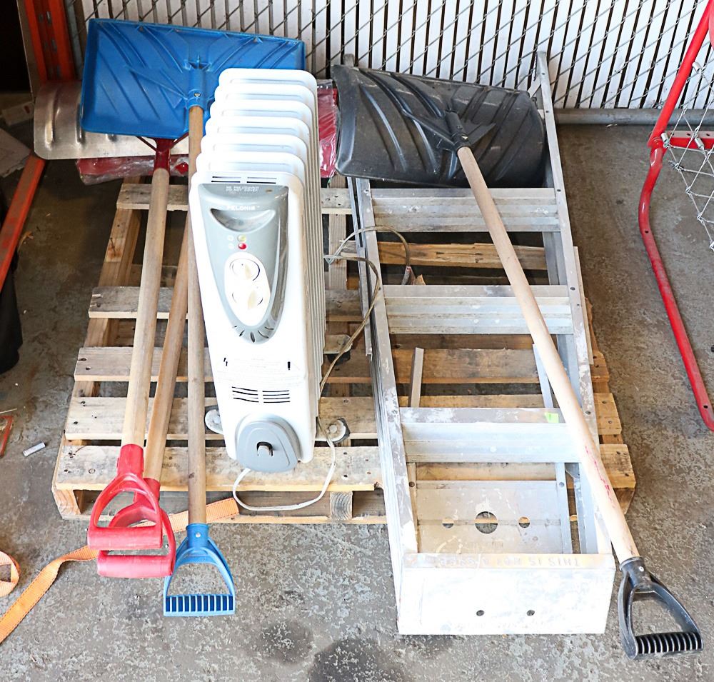 PALLET WITH ASSORTED SHOVELS, ALUMINUM LADDER &