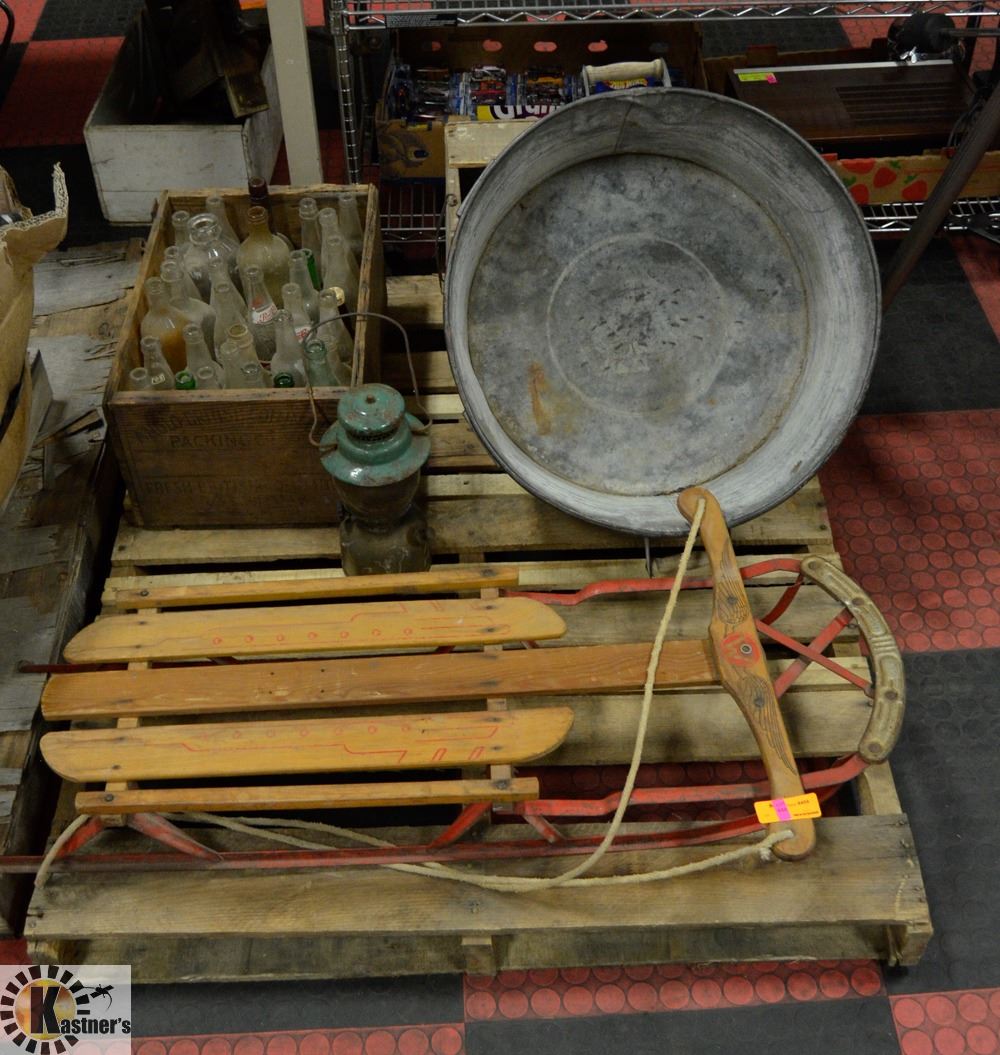 PALLET WITH VINTAGE SLEIGH, WASH BUCKET, BOTTLES